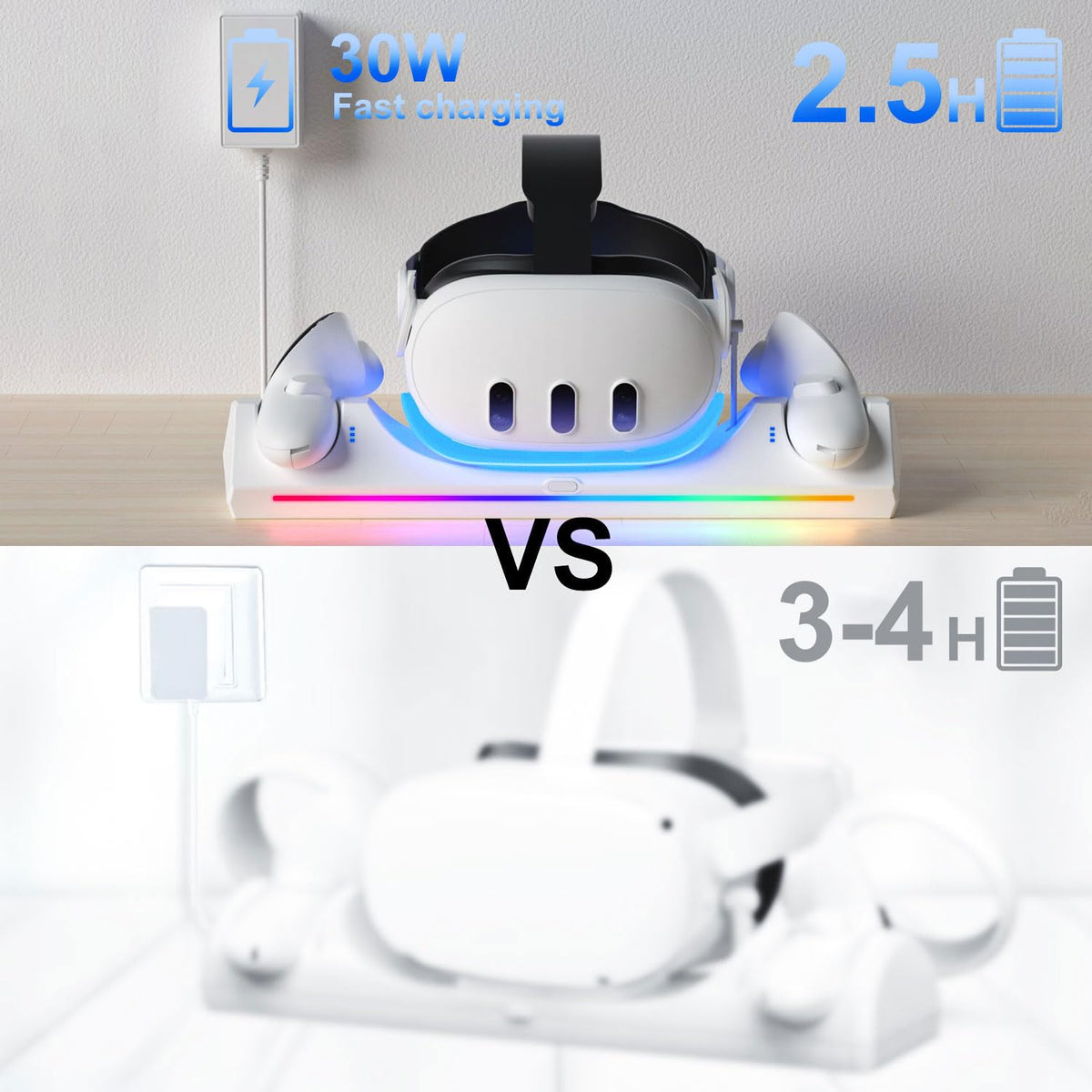 Q: How fast does the Eslick Charging Station charge the Oculus Quest 3 headset?A: The Eslick Charging Station is equipped with a 30W charging adapter that fully charges the Oculus Quest 3 headset in just 2.5 hours, while the controllers take approximately 4 hours to charge.