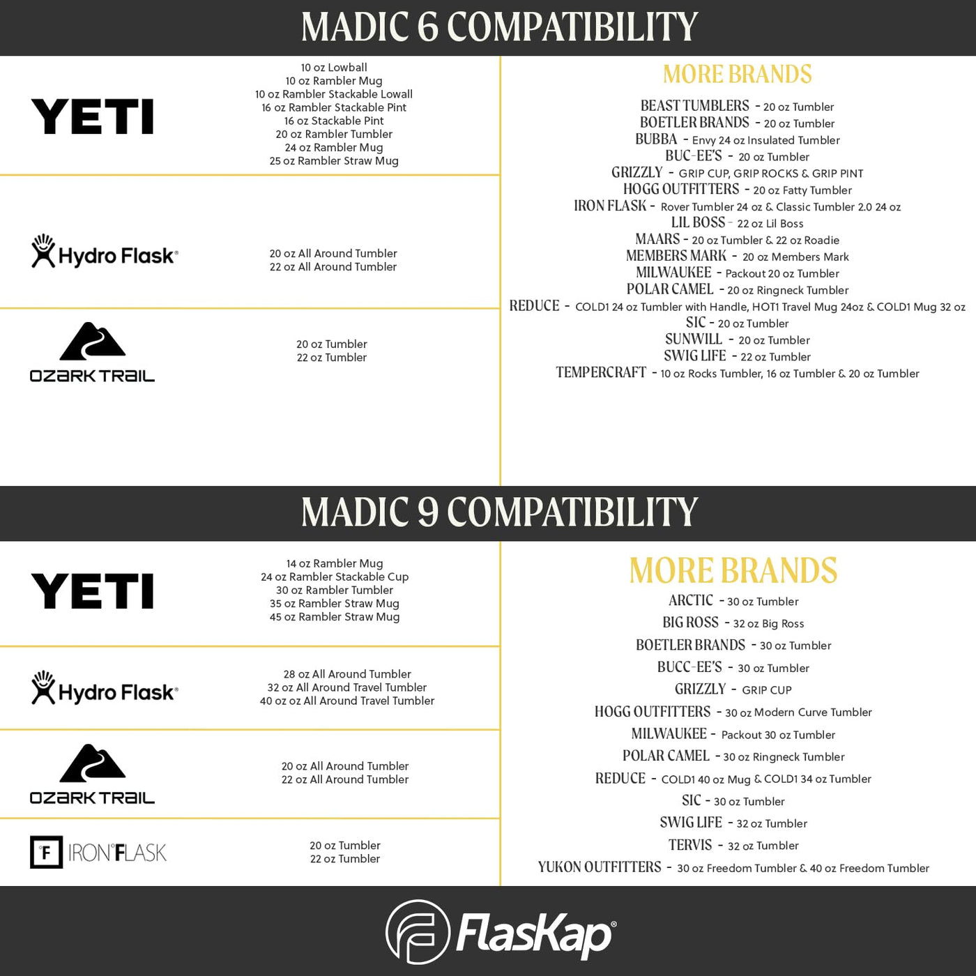Q: Is the Flaskap Madic 6 compatible with all 20 oz tumblers?A: Yes, the Flaskap Madic 6 is designed to be compatible with most 20 oz insulated tumbler brands through its innovative press-fit technology, making it a versatile replacement lid.