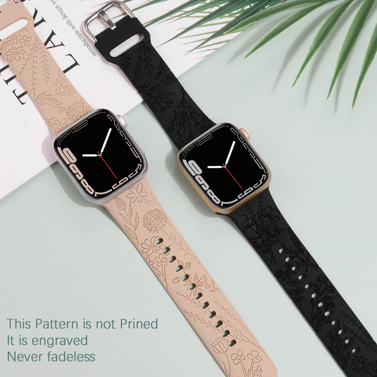 Variety Of Colors&Patterns Design:Natural Wild Flower And Plants Engraved Sport Bands Adopt Two Different Birth Flower Groups Pattern Design.Personalize Decorative Your Iwatch With These Fun Prints Engraved Bands To Fit Your Mood And Outfit In Daily Life,&Nbsp 2 Pack High Quality New Design: Silicone Engraved Smartwatch Strap Adds Nice Detail. Chic And Fashionable As Well As Functional. Highlight Your Unique Taste And Make You Stand Out Of The Crowd, The Bands Are As A Delicate Gift For Women Girly. Premium Silicone Material: Made Of Soft And Smooth Silicone, Is Breathable, Lightweight, Waterproof, Sweat-Proof, Dirt-Proof, Durable, Flexible, Fadeless Soft &Amp; That Is Soft To The Touch, And Prevent Skin From Irritation.