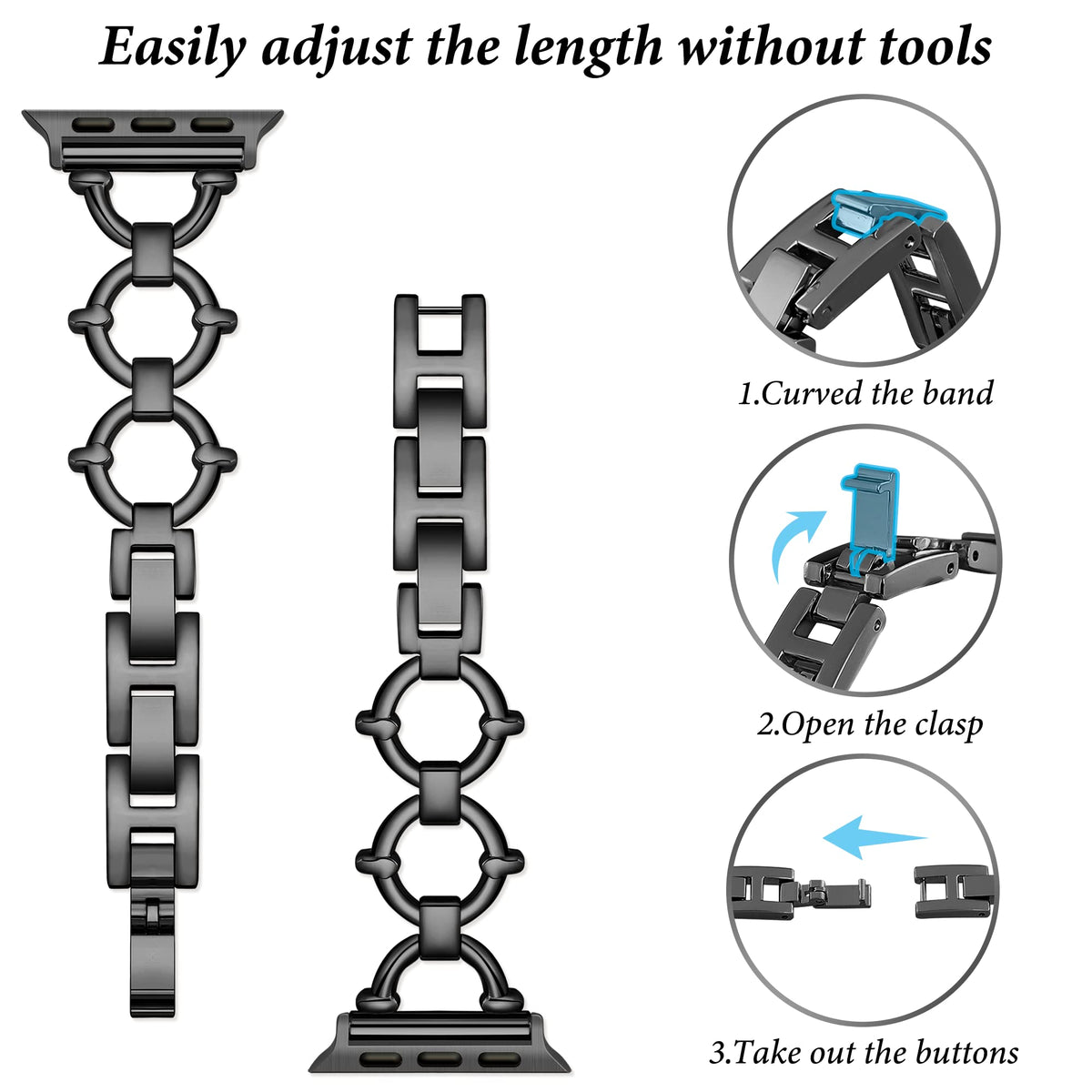 Q: How do I adjust the length of the G-ficu Apple Watch Band?A: The G-ficu Apple Watch Band can be easily adjusted without any tools. Simply open the clasp to add or remove links, allowing you to perfectly fit the band to your wrist size, which accommodates wrists from 5.31 to 7.95 inches.