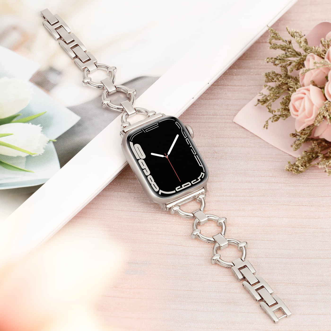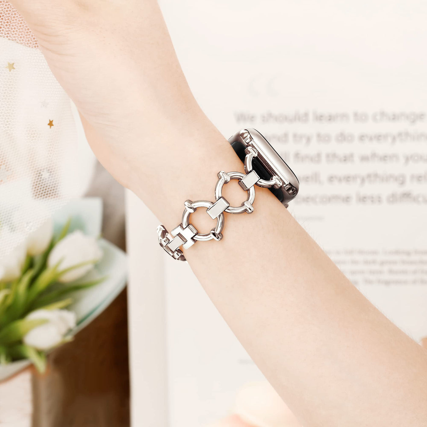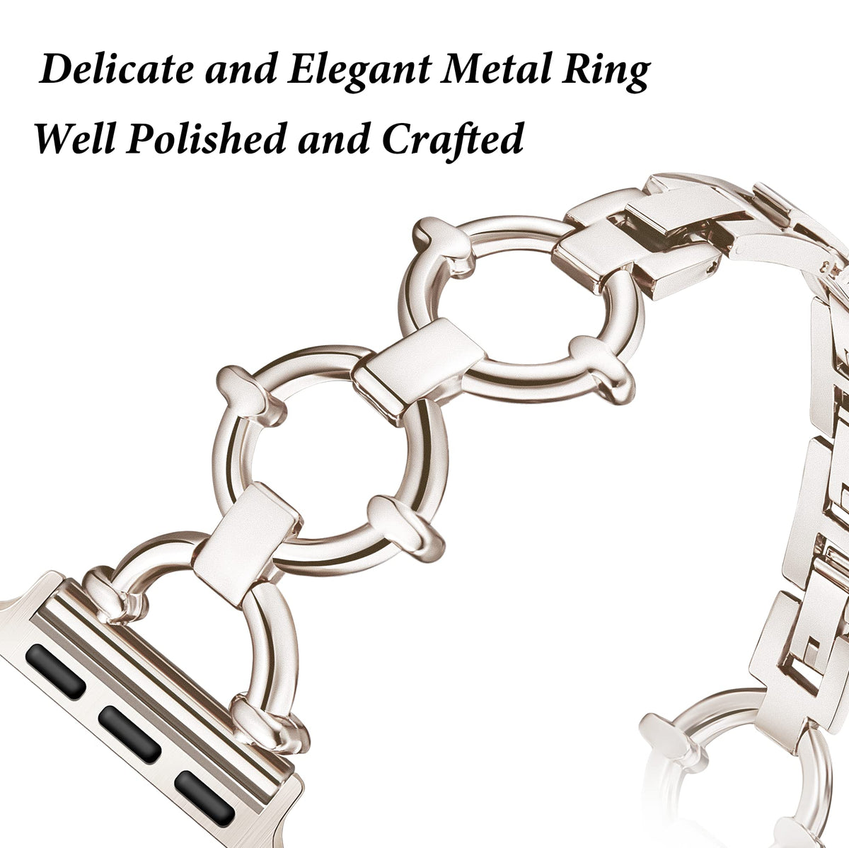 Both Sides Of The Band Are Elegantly Circles And Semi-Circles, Which Will Enhance Your Everyday Style In A Sleek And Minimal Way Its Thin And Airy Appearance Makes Your Apple Watch Feminine And Graceful If Youre Looking For A Quality, Subtle, And Elegant Watch Band, Youve Come To The Right Place &Nbsp The Unique Glossy Circle Design Of The Band Is Gorgeous And Eye-Catching, Which Is Suitable For The Dressing Styles Of Vintage, Smart Casual, Literary, Sweet, Etc &Nbsp Our Fashionable Slim And Light Band Is Greatly Skin-Friendly, Breathable And Durable, For Its Made Of Superb Alloy Materials And Well Polished Every Detail &Nbsp The Ring-Shaped Apple Watch Band Is Compatible With 45Mm 41Mm 44Mm 42Mm 40Mm 38Mm Apple Watch Series 7 6 Se 5 4 3 2 1 The Connectors And Clasps Of The Band Are Particularly Reliable And Safe, Which Will Lock Your Watch Firmly Enough &Nbsp Receive Compliments This Attractive Watch Band Will Be Your Best Accessory Choice To Enhance Your Image And Help You Easy To Receive Compliments It Is Perfect To Match Your Different Clothes Every Day, For Work, Date, Party, Shopping, Show, Any Leisurespecial Occasions &Nbsp Easy To Adjust With One Of The Easiest Length Adjustment Methods, The Apple Watch Band Can Be Directly Adjusted The Length By Opened The Clasp With Your Finger, And No Tool Is Needed &Nbsp Reat Surprise Gift For Its Extraordinary Design And Wonderful Meaning, We Believe It Will Be A Perfect Gift For Family And Friends On The Birthdays, Valentines Day, Mothers Day, Christmas, Thanksgiving And Other Festival