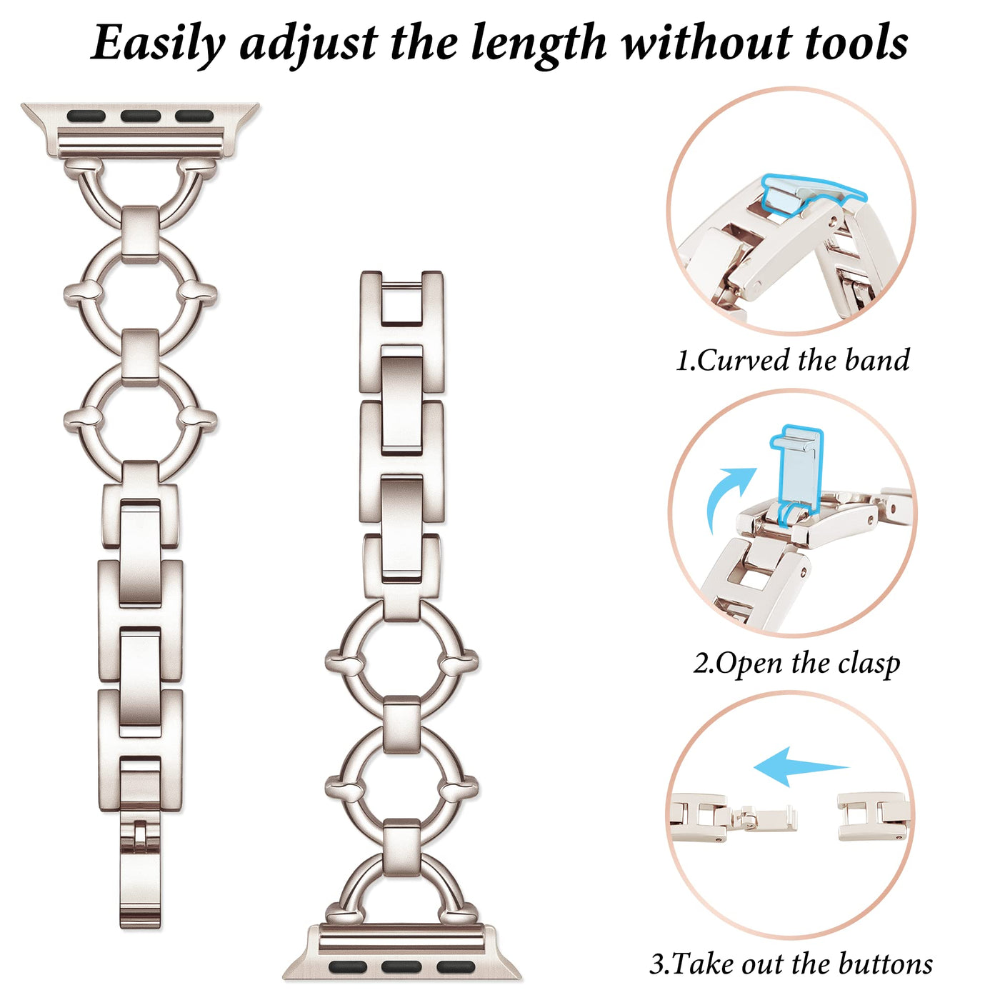 Q: How do I adjust the length of the watch band?A: The apple watch band features an easy length adjustment method. Simply open the clasp with your finger to remove or add links, allowing you to adjust the size without any tools.