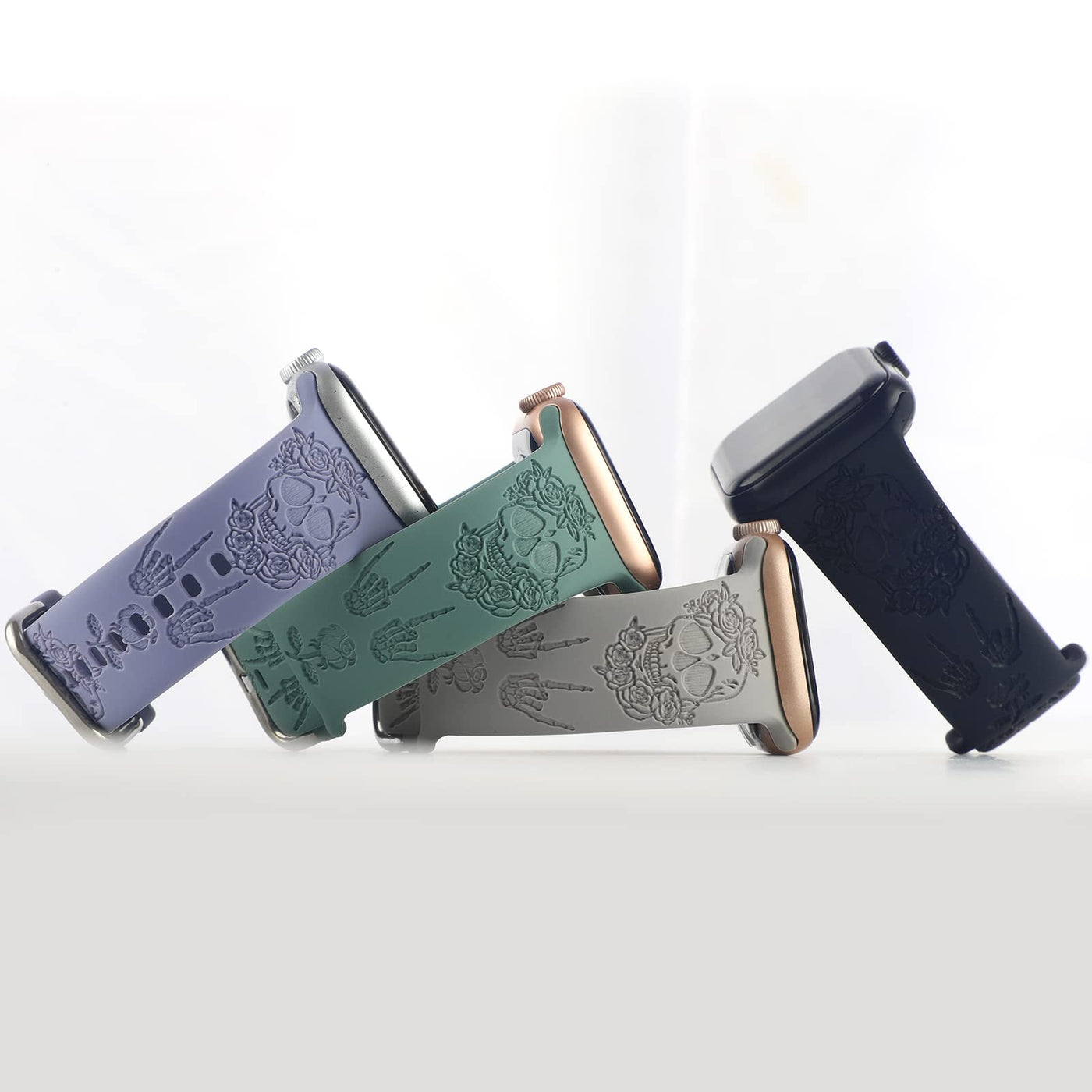 Q: Is the Halloween Floral Engraved Silicone Band compatible with all Apple Watch models?A: Yes, the Halloween Floral Engraved Silicone Band is compatible with Apple Watch models 1 through 9, including SE, Ultra, and Ultra 2, fitting sizes 42mm, 44mm, 45mm, and 49mm.