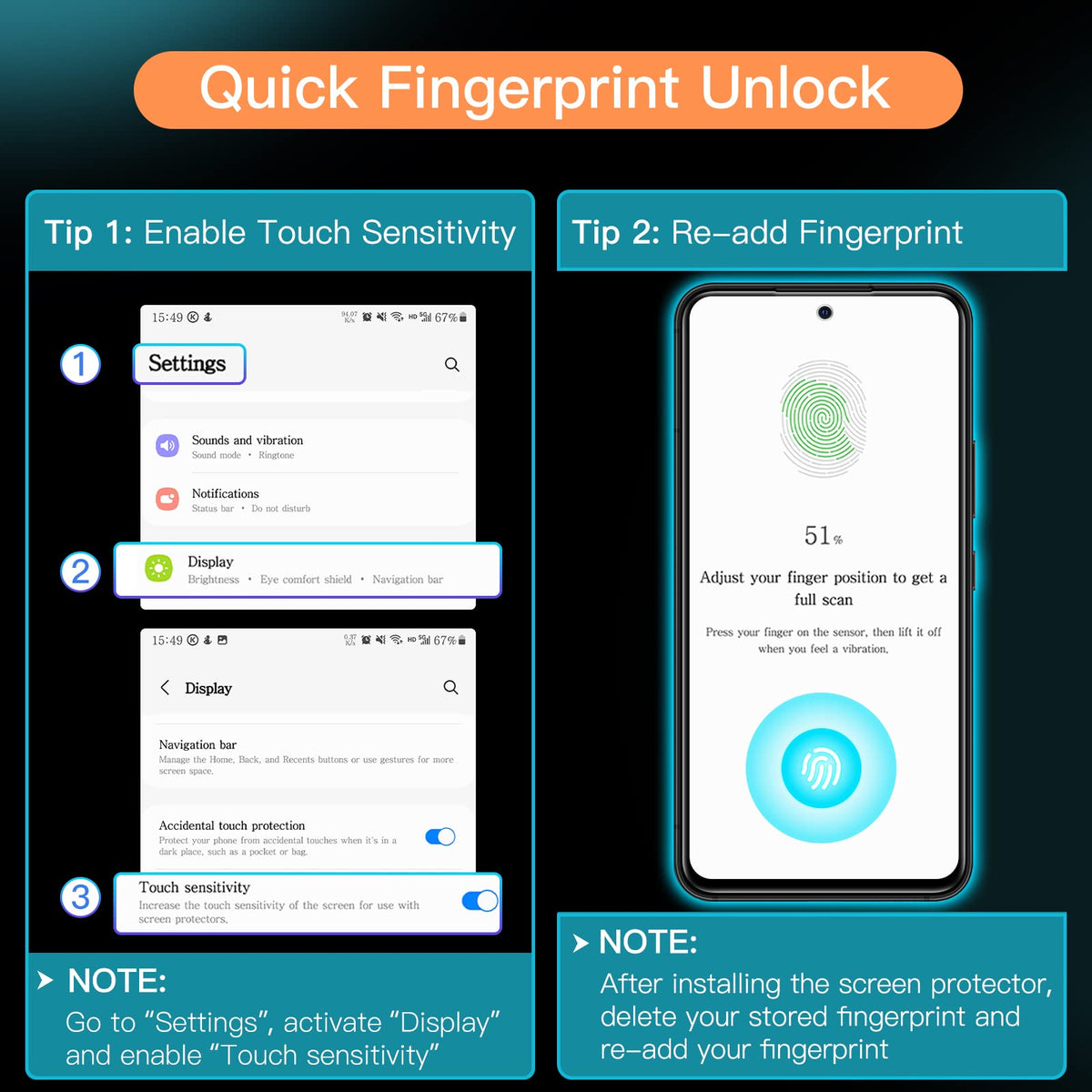Q: Will the screen protector affect the fingerprint recognition feature?A: To enhance fingerprint recognition after applying the screen protector, it is recommended to activate the Touch Sensitivity feature in your device settings and re-enter your fingerprint for optimal performance.