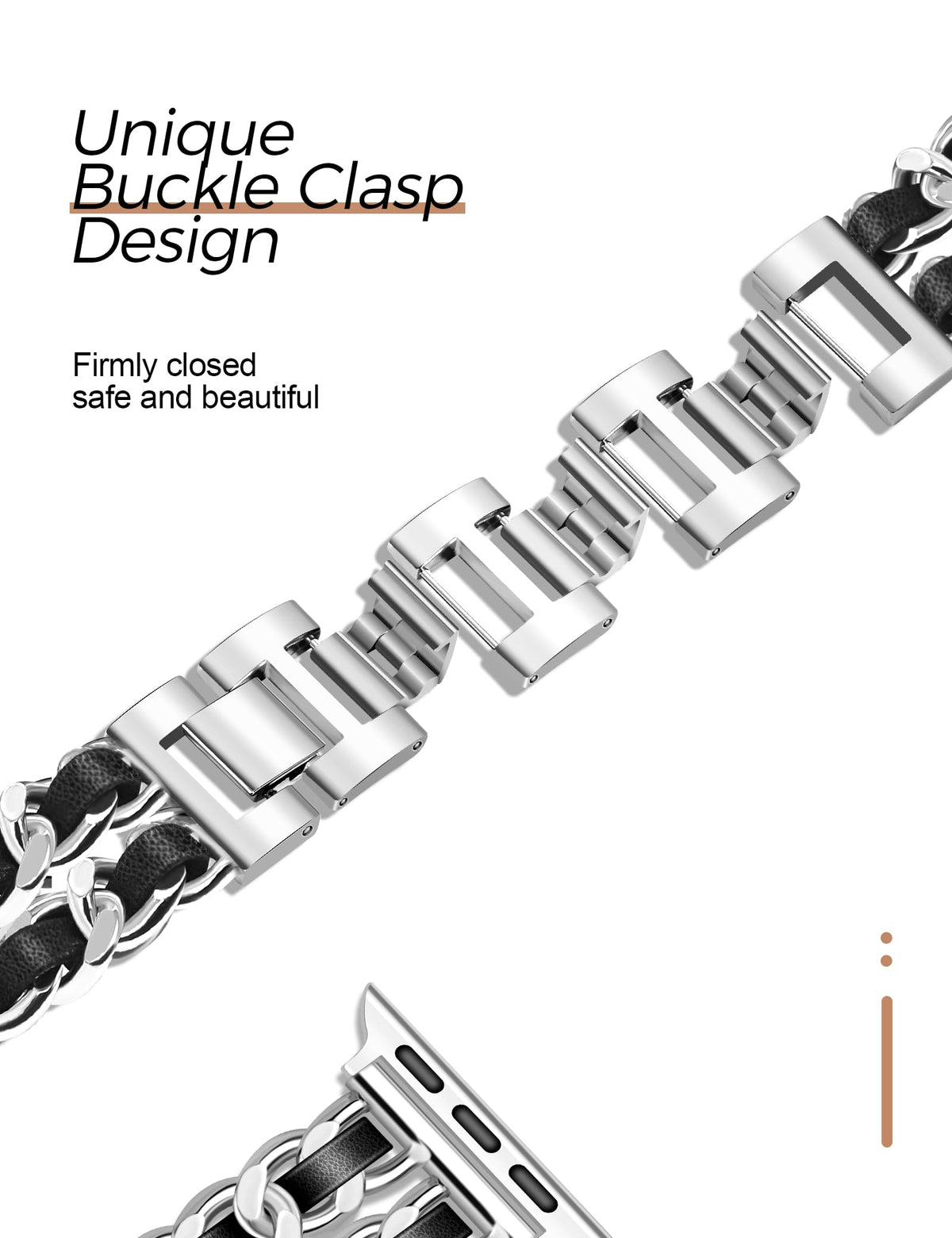 Q: How does the unique buckle clasp work for safety?A: The JR.DM watch band features a unique buckle clasp design that ensures a secure fit on your wrist. It is easy to wear and remove, providing both beauty and safety to keep your Apple Watch securely in place.