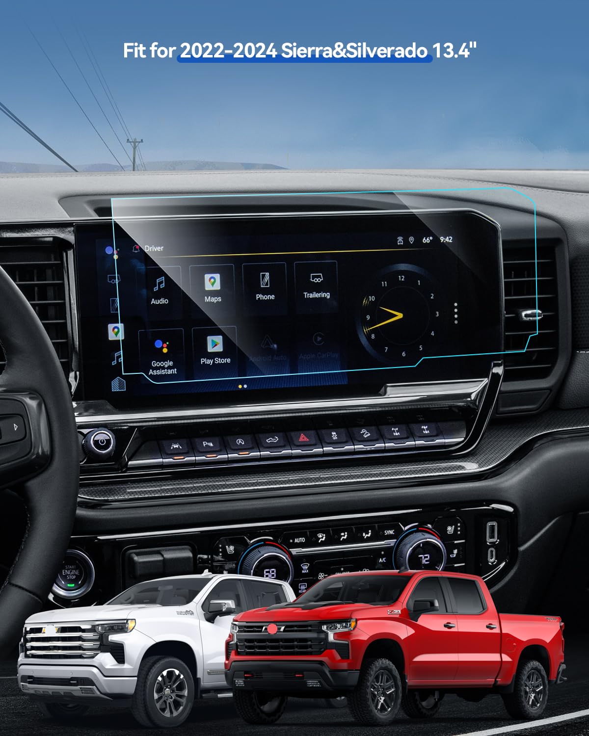 Q: Is the LANTU screen protector compatible with my 2022 GMC Sierra?A: Yes, the LANTU screen protector is specifically designed to fit 2022-2024 GMC Sierra and Chevrolet Silverado models, including the 1500, 2500HD, and 3500HD, ensuring a perfect edge-to-edge fit.