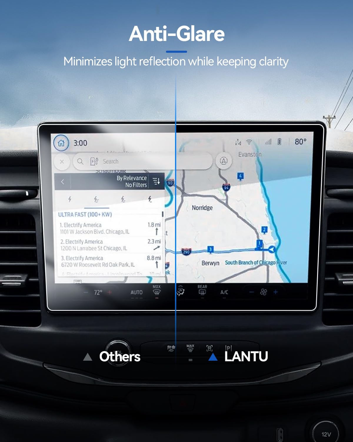 Q: How does the LANTU screen protector reduce glare on my car's display?A: The LANTU screen protector features anti-glare properties that enhance readability in bright sunlight. This helps improve visibility while driving, making it safer and more comfortable to use your navigation system.