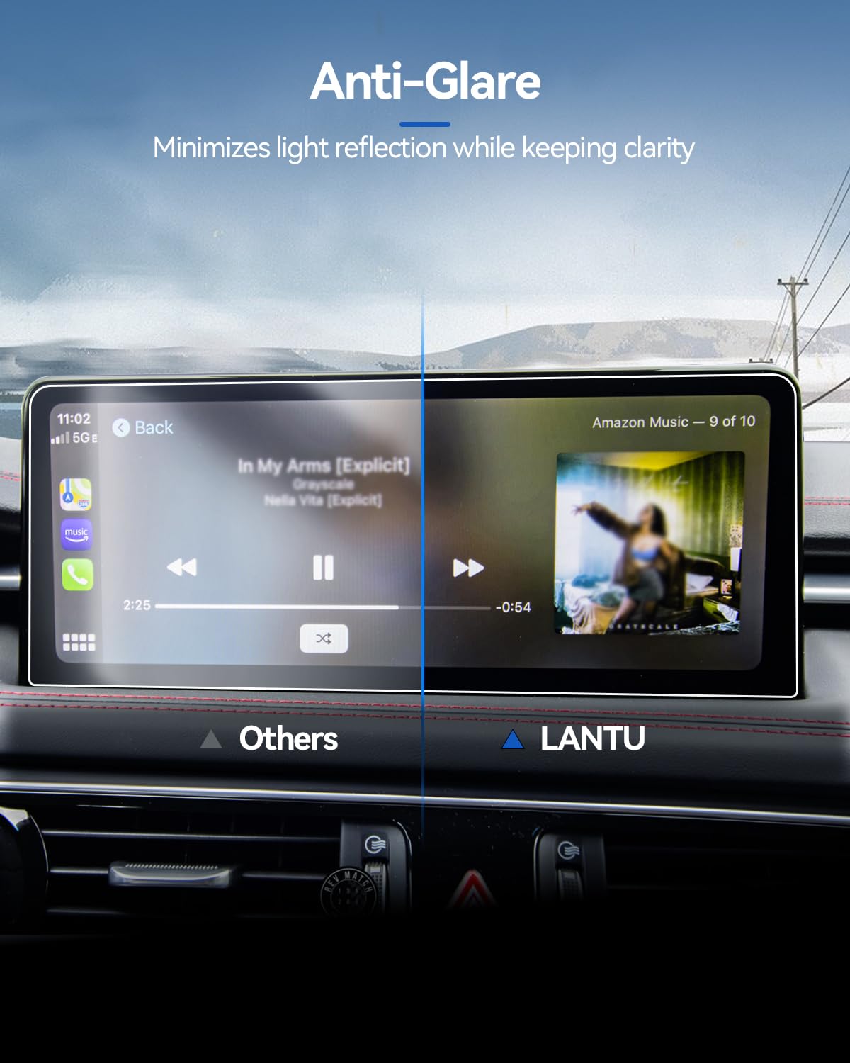 Q: How does the LANTU Screen Protector enhance driving safety?A: The LANTU Screen Protector features anti-glare properties that significantly reduce reflections and improve screen readability in bright sunlight. This allows for safer navigation and driving by minimizing distractions and enhancing visibility.