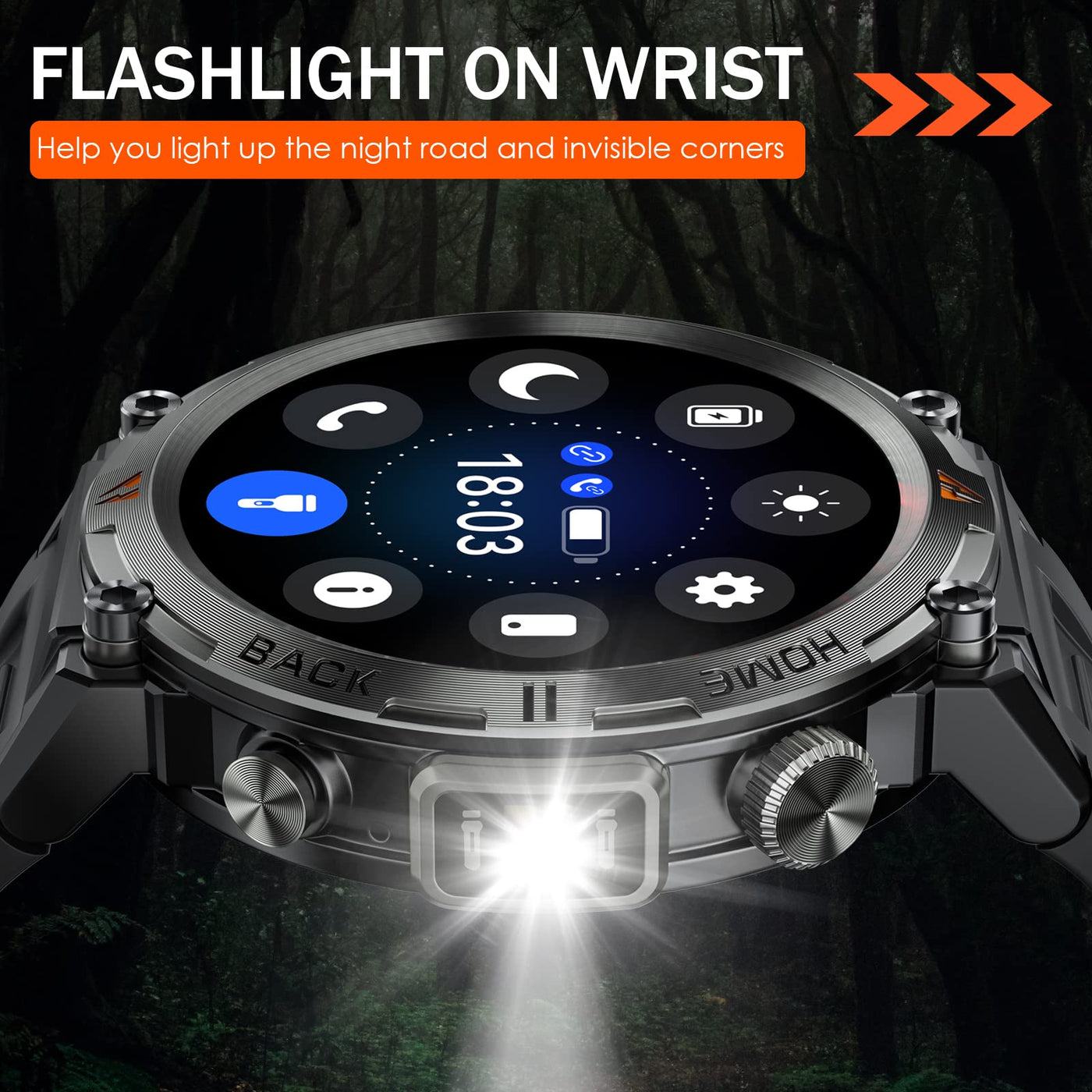 Military Smart Watch For Men With Led Flashlight 1.45 Rugged 3Atm Waterproof Smart Watch With 100+ Sports Modes Fitness Track