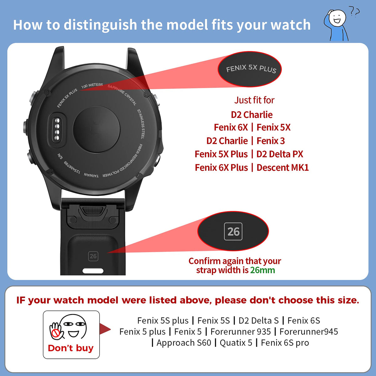 Product Note:Fit For 26Mm Garmin Fenix 5X/Fenix 5X Plus/Fenix 3/Fenix 3 Hr Smartwatch. Pls Note That This 26Mm Band Won'T Fit The Garmin Fenix 5 Or 5S. Installation Steps: Step 1. Push And Hold The Button In The Connection Part. Step 2. Put It Into The Connection Pin And Release The Button. Step 3. Lock The Other Side To The Watch. Finished.