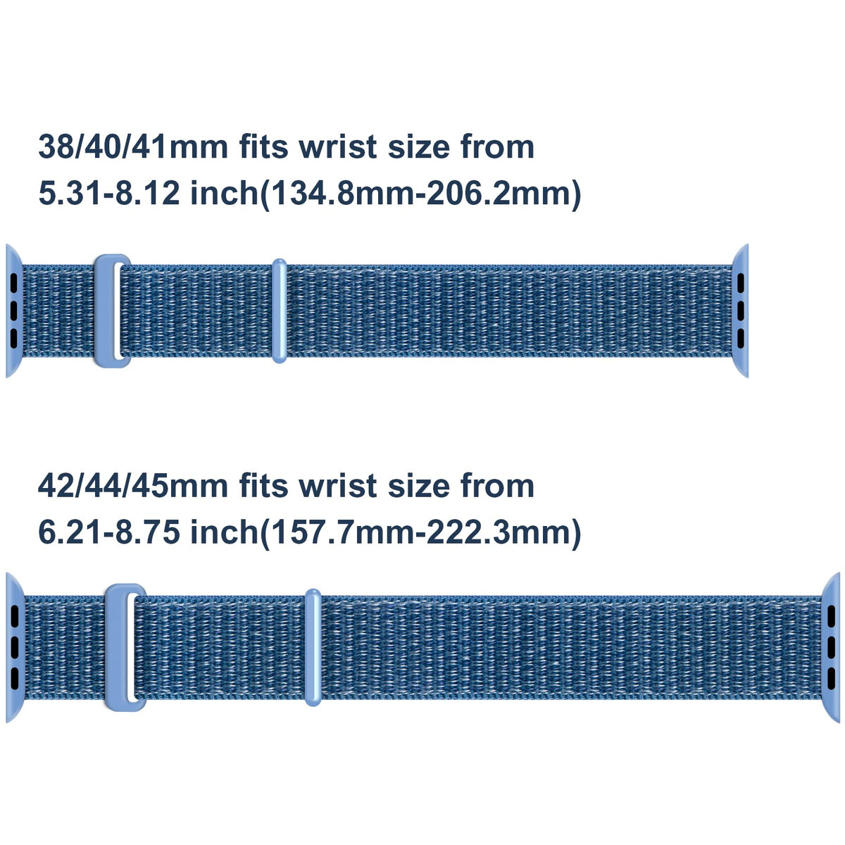 Q: What sizes do the Nylon Sport Loop Bands come in?A: The bands are available in two size ranges: 38/40/41mm for wrist sizes from 5.31" to 8.12" and 42/44/45mm for wrist sizes from 6.21" to 8.75".