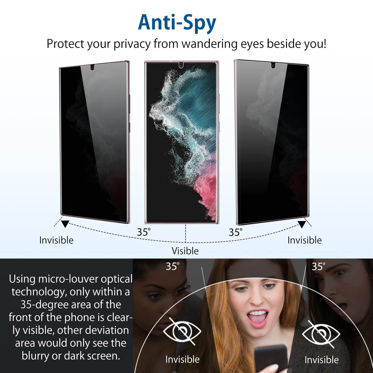 Phisimoo Samsung Galaxy S22 Ultra Privacy Screen Protector Enables You To Enjoy Your Privacy Space Better, And Provides Maximum Protection For Your Phone, Including Anti Daily Scrape, Anti Stain, And Reduce The Chance Of Screen Cracking Due To Drops Features: Anti-Spy: The Screen Image Is Visible In The Direction Of 90 Degrees From The Front Of Your Phone, But Not Visible Outside The Area That Is 35Degrees To The Left Or The Right Support Ultrasonic Fingerprint Id Response Quickly Made Of Ultra-Thin And Ultra-Smooth Tpu Material, It Maintains The High Sensitivity And Responsiveness Of The Original Screen, Providing You With A Smooth And Fluid Touch Experience With Excellent Flexibility And Unique Shock-Absorbing Layer Structure Design, It Can Effectively Decompose Impact And External Pressure To Protect The Screen Perfect Protection: It Will Be Your Best Choice Because It Can Provide Edge-To-Edge Protection For Your Device Anti-Fingerprint And Anti-Greasy: The Surface Is Treated With Plasma Oleophobic Coating, So It Can Effectively Reduce Fingerprint Smudges, Oil And Dust Keep The Screen Clean As New Self-Healing: Scratch-Resistant And Bubble-Free Case Friendly: Its Precise Size Makes Your Phone Compatible With Most Phone Cases Attention: Because Of The Anti-Peeping Feature, The Brightness Of The Screen Will Be Reduced While Using The Film If You Wish To Enjoy A Better Experience, We Suggest That You Adjust The Brightness Of Your Phone Before Applying The Film, Please Watch The Installation Video Carefully And Follow The Instructions If There Are Tiny Bubbles, Dont Worry They Will Disappear Automatically Within 24 Hours It Is Recommended That You Update The Fingerprint Id Again After Finishing The Installation So That It Can Be More Sensitively Recognized