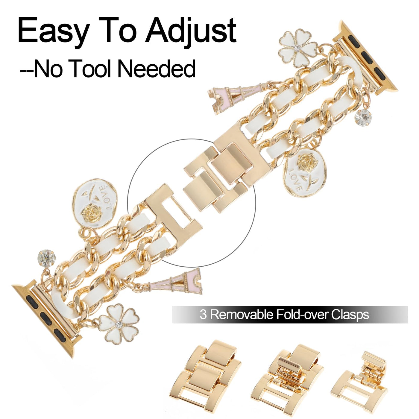 Specifications: Replacement For Apple Watch Band Material: Metal,Leather Product Style:Stylish Color:Golden Watch Band Quantities Of Pendants On The Golden Chain: 2 Exquisite Pink Eiffel Towers 2 Beautiful White Flowers 2 Engraved With Golden Rose And 'Love' Pendants 2 Sparkly Bling Diamonds Product Net Weight:About 59.9G (2.11Oz) Product Size:165Mm(Length)X20Mm(Width) (6.5 *0.79 ) Package Size: 228Mm(Length)X70Mm(Width) (8.98 *2.76 ) Compatible Models: Compatible With Apple Watch 38Mm 40Mm 41Mm Compatible With Apple Watch 42Mm 44Mm 45Mm Compatible With Apple Watch Series 9,Series 8,Series 7,Series 6,Series 5 Compatible With Apple Watch Series 4, Series 3,Series 2,Series 1 Compatible With Apple Watch Ultra 49Mm Compatible With Apple Watch Se What'S In The Box? 1 X Metal Watch Band(Watch Not Included) About Realsign: 1.We Sell Various Types Of Watch Bands,Watch Band Charms Accessories.We Sell Watch Straps Made Of Various Materials,Items With Original And Stylish Styles. 2.All Our Products Use Premium Materials,Have Good Quality And Are Well Packaged,We Provide Good Pre-Sales And After-Sales Services. 3.If You Have Any Questions About Our Products,Please Contact Us By Email And We Will Provide You With A Solution As Soon As Possible.