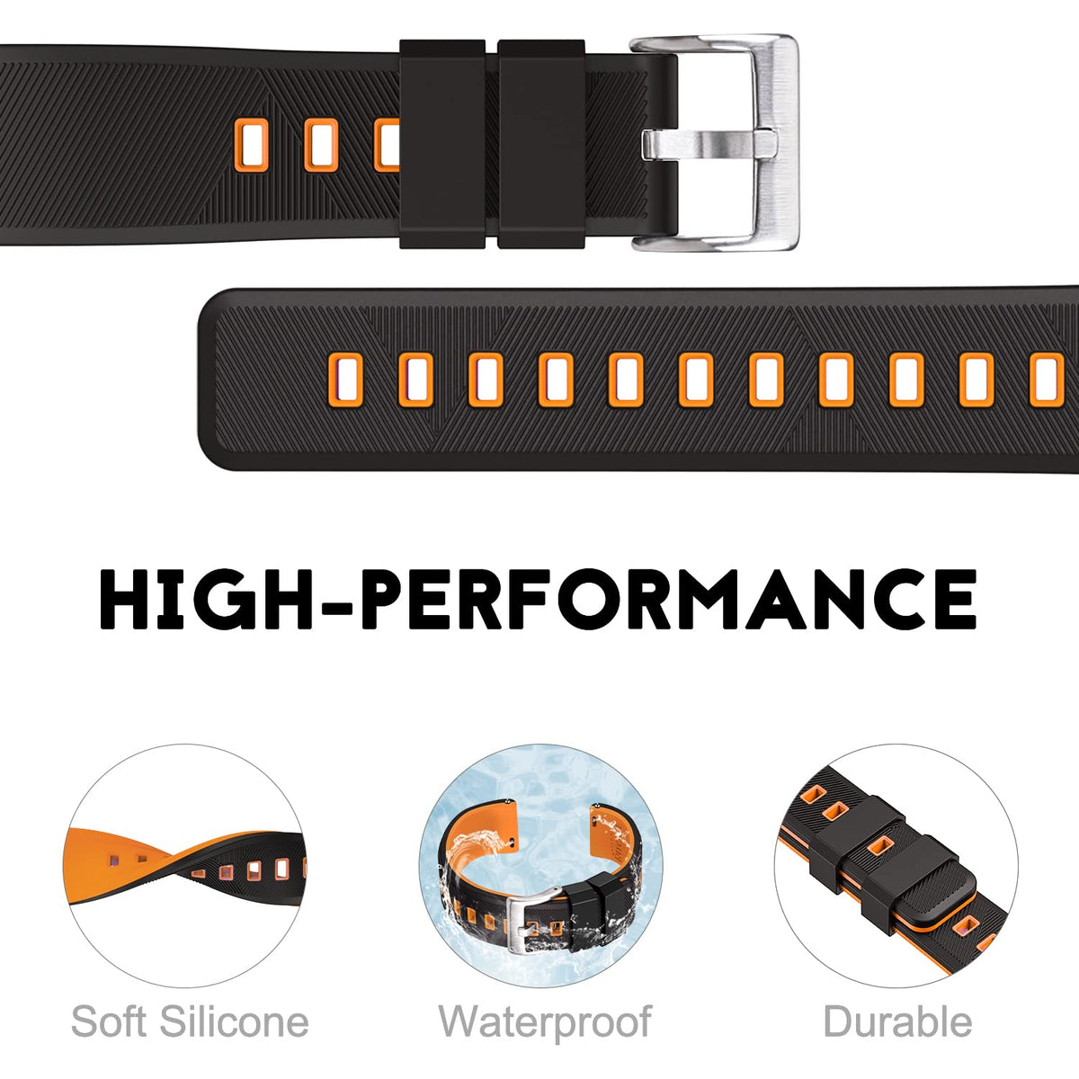 Q: What are the main features of the Ritche silicone watch band?A: The Ritche silicone watch band features a premium flexible elastomer that is waterproof and lightweight. It includes quick release spring bars for easy band changes, is sweat and water resistant, and has a stripe texture with a special rubber loop to secure the strap during activities.
