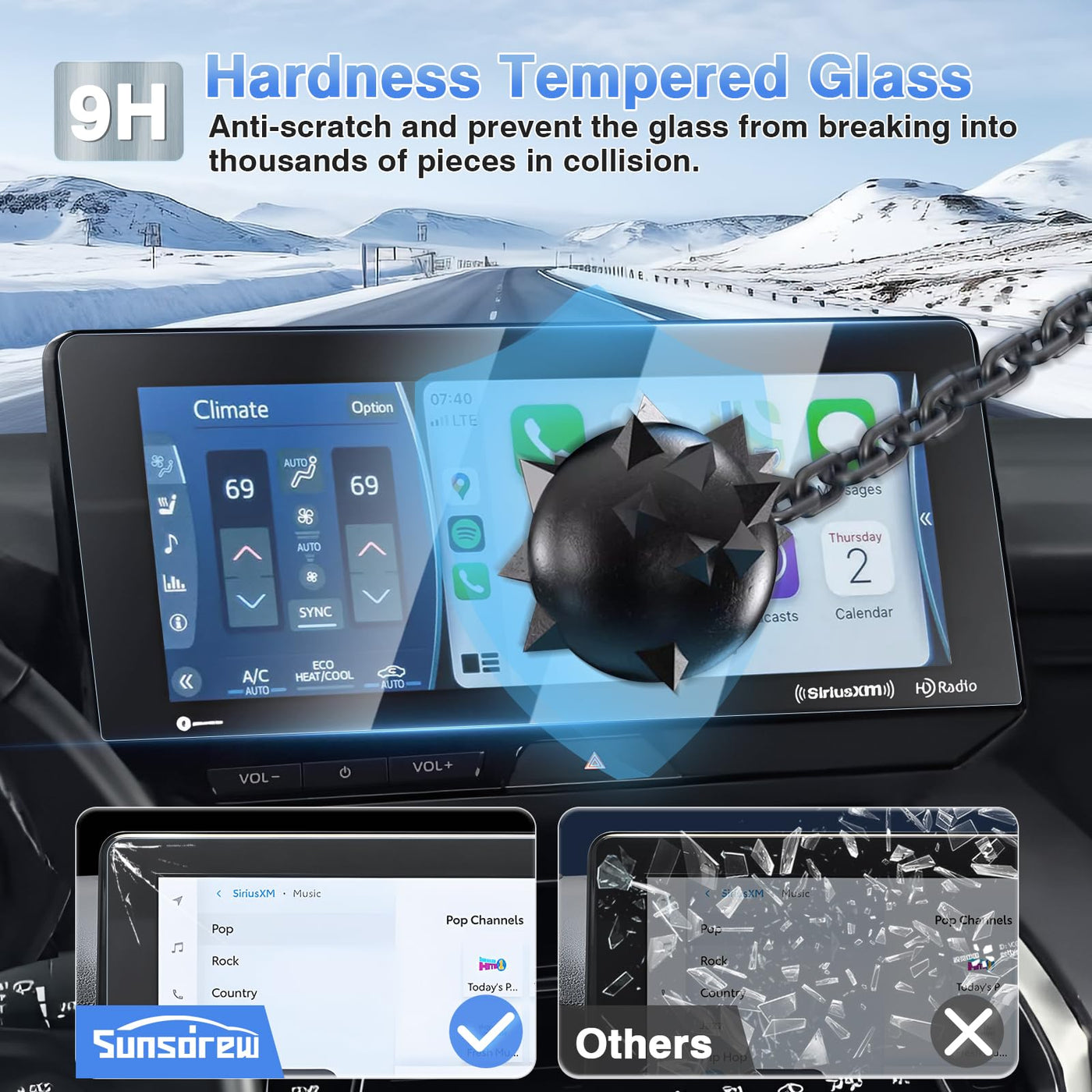 Q: How does the anti-glare feature work on this screen protector?A: The Sunsdrew screen protector is engineered with anti-glare technology that minimizes reflections and allows for clear visibility even in bright sunlight or while wearing sunglasses, enhancing your driving experience.