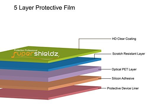 Q: What materials are used in the Supershieldz screen protector?A: The screen protector is constructed from Optical Grade Crystal Film, comprising five layers, including a scratch-resistant surface polymer and a patented silicone gel that securely adheres to the device without the use of adhesive.