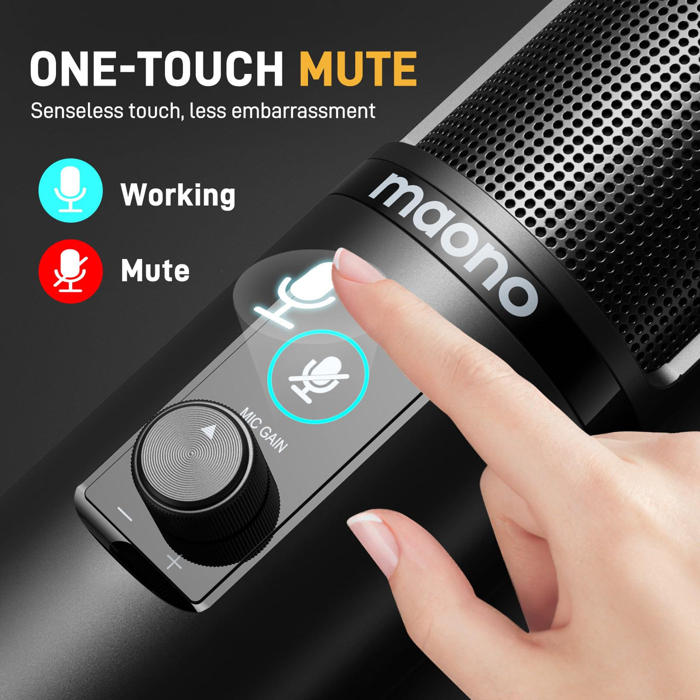 Q: How does the one-touch mute function work on this microphone?A: The MAONO microphone includes a one-touch mute button that allows you to quickly silence the microphone during use. An LED indicator light shows the status: green when active and red when muted, making it convenient for situations like coughing or sneezing.