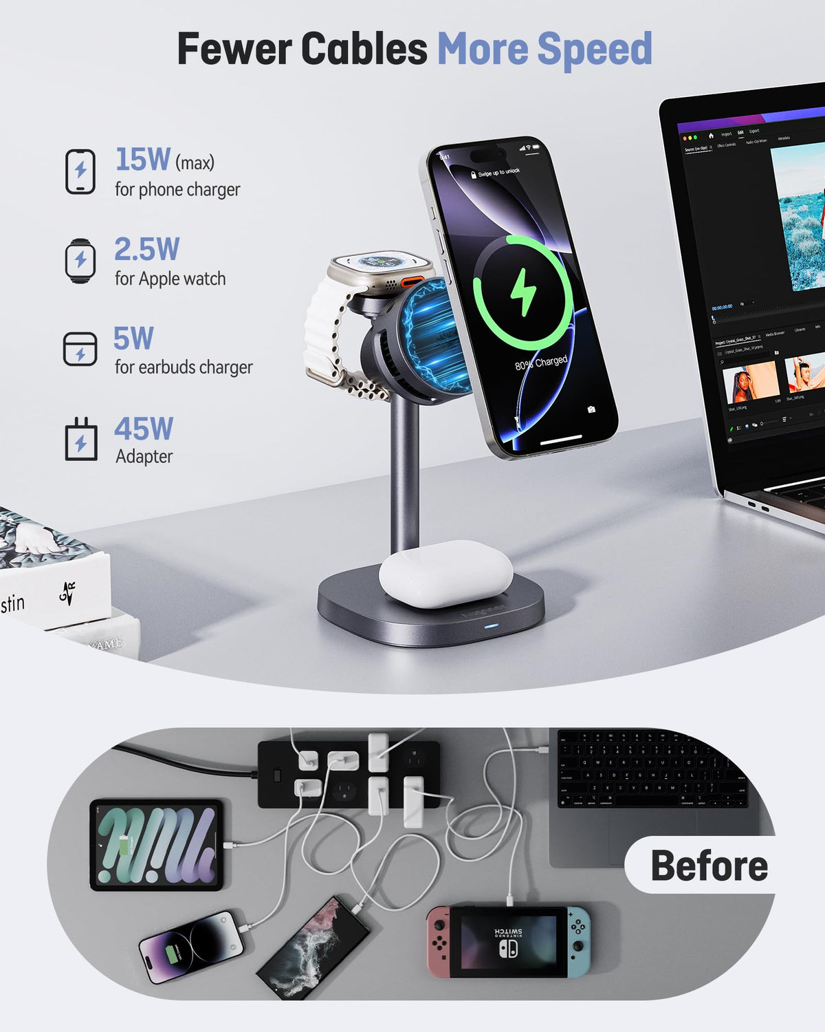 Introducing The Next-Gen Semiconductor-Cooled Qi2 Magnetic Wireless Charging Stand, A Revolutionary Fusion Of Cutting-Edge Cooling Technology And Ultra-Fast Wireless Charging. Designed For Tech Enthusiasts Who Demand Both Speed And Reliability, This Charger Combines 15W Qi2-Certified Magnetic Charging With Advanced Semiconductor Cooling To Ensure Your Devices Stay Cool Even During Rapid Power-Ups. Uniquely Designed To Simultaneously Power Up Your Iphone, Apple Watch, And Magsafe-Compatible Airpods At Peak Efficiency, 3 In 1 Wireless Charging Station For Apple Eliminates Cluttered Cables While Delivering 15W Qi2 Fast Charging, 45W Pd-Powered Stability, And Active Cooling. Say Goodbye To Overheating Bottlenecks And Hello To Uninterrupted Productivity! Its Engineered For Apple Loyalists Who Prioritize Speed, Safety, And Minimalist Convenience.