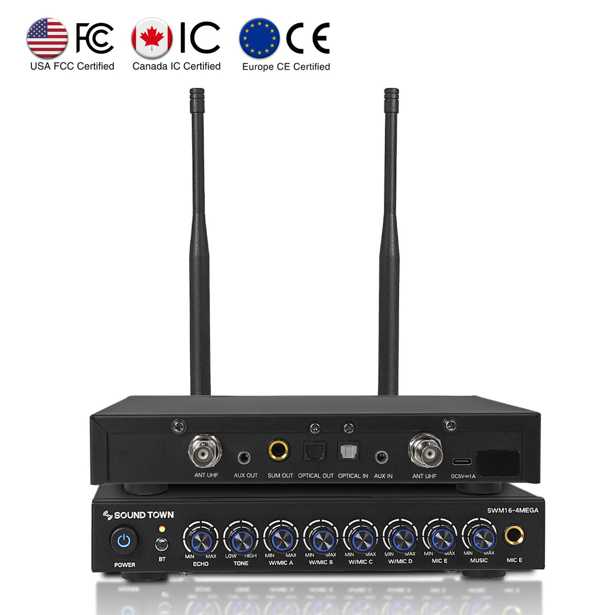The Sound Town Swm16-4Mega Is A Compact Wireless Microphone And Karaoke Mixer System. It Comes With Four Channels, 50 Selectable Uhf Frequencies Per Channel (200 Channels In Total) And Is Interference-Free. The Receiver Has One 3.5Mm (1/8'') Trs And One Optical Input Connector, And One 3.5Mm, 6.35Mm (1/4'') Trs And One Optical Output Connector. With Flexible Connecting Options, It Makes Setup A Breeze, Allowing Easy Integration With Your Home Theater Or Speaker System. It Supports Both Wireless And Wired Microphones, With Individual Volume Controls For Each Channel. This System Is Compatible With A Wide Range Of Sound Bars, Home Receivers, Speakers Such As Bose, Sonos And More. With Ultra-High Frequency (Uhf, 550-590 Mhz), The Swm16-4Mega Karaoke System Is Less Likely To Get Interference From Other Equipment Compared With A Vhf System. It Has 4 X 50 Selectable Frequencies And Is Compliant With The Latest Fcc Regulations. The System Includes Four Metal Handheld Microphones Designed To Protect Sensitive Electronics From Impact Damage. Whats More, Each Is Equipped With A Usb-C Charging Port, Ensuring Faster Charging And Convenient Connectivity Options. The Swm16-4Mega Receiver Is A Powerful Sound Mixer Equipped With Rotary Controls, Allowing You To Adjust Echo, Tone, And Volume For Both Wireless And Wired Microphones. Its Ideal For A Variety Of Settings Such As Conferences, Broadcasting, Weddings, Karaoke, Social Events, As Well As Venues Such As Meeting Rooms, Auditoriums, Schools, Churches, And Small Stages. The Swm16-4Mega Receiver Features Two Detachable Antennas. Additionally, It Comes With Built-In Bluetooth, Enabling You To Connect With Various Devices Such As Laptop, Smart Phones, Tablets And Ipad. The Systems Bluetooth Switch Allows You To Easily Toggle Bluetooth On And Off.
