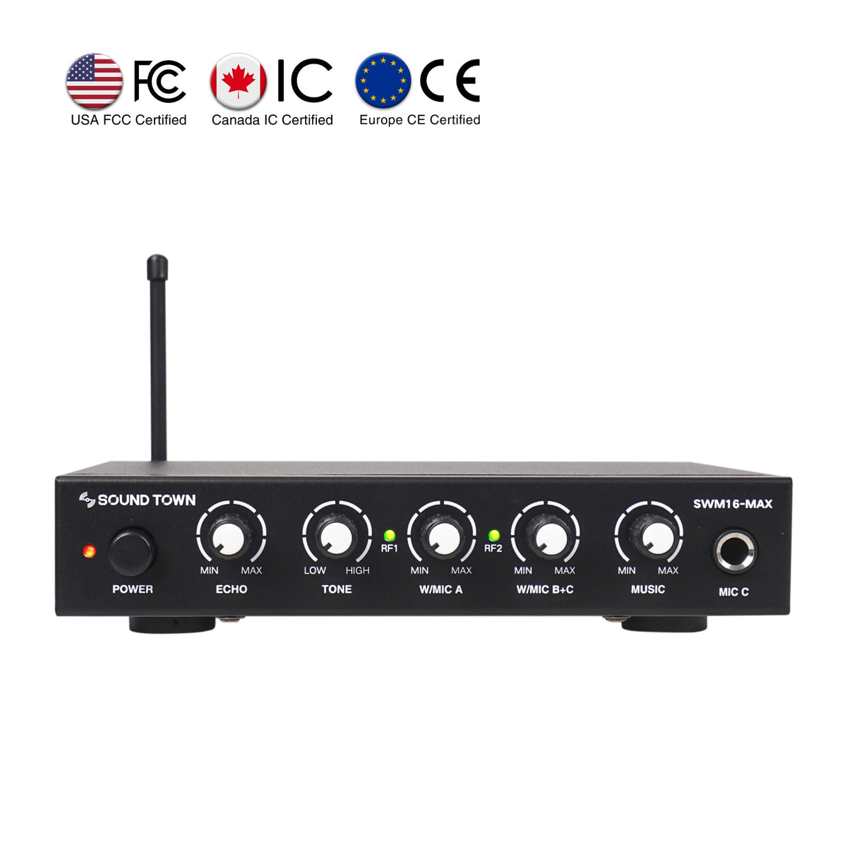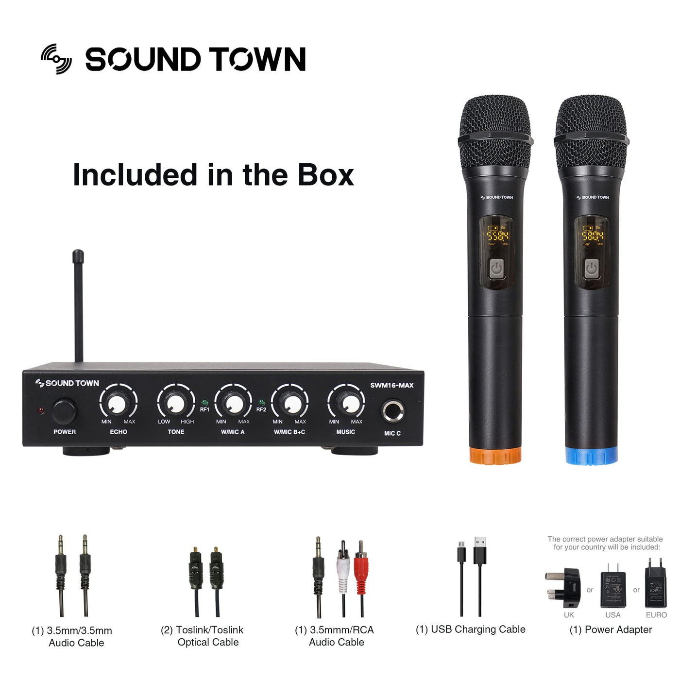 The Sound Town Swm16-Max Is A Compact Wireless Microphone And Karaoke Mixer System. It Comes With Dual-Channel, 8 Selectable Uhf Frequencies Per Channel (16 Channels In Total) And Is Interference-Free. The Hdmi, Hdmi Arc, Optical (Toslink), 3.5Mm Aux Input/Output Connectors And Built-In Bluetooth Make It Easy To Connect. The Versatile Input And Output Options On The Swm16-Max Provides Optimal Compatibility With Various Devices. The Swm16-Max Can Be Connected To Several Devices Including Smart Tvs, Home Theater Systems, Receivers, Speakers, Sound Bars, Amplifiers, Notebooks, Tablets, And More, Such As Bose Soundbar 300/500/700, Bose Solo Series, Sonos Beam Soundbar Series, Visio, Samsung, Etc. For Audio Input, The Built-In Hdmi Arc (Audio Return Channel) Connector On The Swm16-Max Mixer Allows You To Connect To Almost Any Smart Tv Through An Hdmi Cable. Simply Plug The Hdmi Cable To The Hdmi Arc Port On Your Smart Tv And Plug The Other End Of The Hdmi Cable To The Hdmi Out (Arc) Port On The Swm16-Max Mixer. The Smart Tv Is Required To Have An Hdmi Arc Port. Hdmi Cables Are Not Included. In The Case Hdmi Arc Is Not Available, You Can Also Connect The Swm16-Max Through Either The Optical Or Aux (3.5Mm) Input. For Smart Tvs, You Will Need To Adjust Your Tvs Audio Settings To Enable Cec & Pcm. For Audio Output, The Swm16-Max Receiver/Mixer Makes The Connection A Breeze By Connecting To Your Sound Bar, Speakers Or Home Receiver With Either An Aux (3.5Mm) Or Optical Connection. The Microphone Receiver And Sound Mixer Enable You To Easily Mix Mic Signal With Music Without Using An Additional Mixer. It Comes With Two Wireless Microphones And Can Support Two Wired Dynamic Microphones (Not Included). The Rotatory Control Knobs Can Swiftly Adjust The Volume Of Your Music, Microphone, Echo And Tone To The Desired Level. The Built-In Pop Filter Reduces Potential Popping Sound And Helps Deliver Consistent And Superb Sound Quality. Its Ideal For Karaoke, House Parties, Conferences, Broadcasting, Weddings, Social Events And Any Small To Medium-Sized Venues Such As Meeting Rooms, Auditoriums, Schools, Churches And Stages. Included In The Box: (1) Swm16-Max Receiver/Mixer (1) Power Adapter (1) Usb Charging Cable (2) Wireless Handheld Microphones (1)3.5Mm (1/8) To 3.5Mm (Male To Male) Audio Cable (1)3.5Mm To Rca (Male To Male) Audio Cable (2)Toslink To Toslink Optical Cables The Wireless Microphone System Needs To Be Connected To A Powered Speaker Or An Amplifier With Passive Speakers (With 1/4'', 1/8 Or Optical Inputs) To Work. These Devices Are Sold Separately. Setup Requirement: Features Flexible Connection Options:With Hdmi Arc (Input Only) And Hdmi, Optical (Toslink), 3.5Mm Aux Input & Output Ports, The Swm16-Max Is Compatible With A Variety Of Devices Such As Smart Tvs, Home Receivers, Soundbars And Etc. Easy To Setup:The Hdmi Arc And Optical Inputs On The Swm16-Max Karaoke Mixer Allows You To Extract The Audio From Your Smart Tv To The Mixer, Blends The Music And Vocal, And Sends The Mixed Signals To A Soundbar Or Amplifier (Hdmi Cable Is Not Included) Interference-Free:The Wireless Microphone System Comes With Ultra-High Frequency (Uhf, 550-590 Mhz) Which Is Less Likely To Get Interference From Other Equipment Compared With A Vhf System. It Has 16 Selectable Frequencies (8 Frequencies Each Channel) And Is Compliant With The Latest Fcc Regulations Two-In-One:The Wireless Microphone Receiver Is Also A Sound Mixer And Equipped With Rotatory Controls Which Allow You To Adjust Echo, Tone And Volume Of The Mics; Its Ideal For Conferences, Broadcasting, Weddings, Karaoke, Social Events And Any Small To Medium-Sized Venues Such As Meeting Rooms, Auditoriums, Schools, Churches And Small Stages Instant Karaoke Fun:With Versatile Input And Output Options, Built-In Mixer And Two Wireless Microphones, The System Provides Optimal Compatibility With Various Devices And Is Perfect For Karaoke, Dj Music, House Parties And Speaking Events Su
