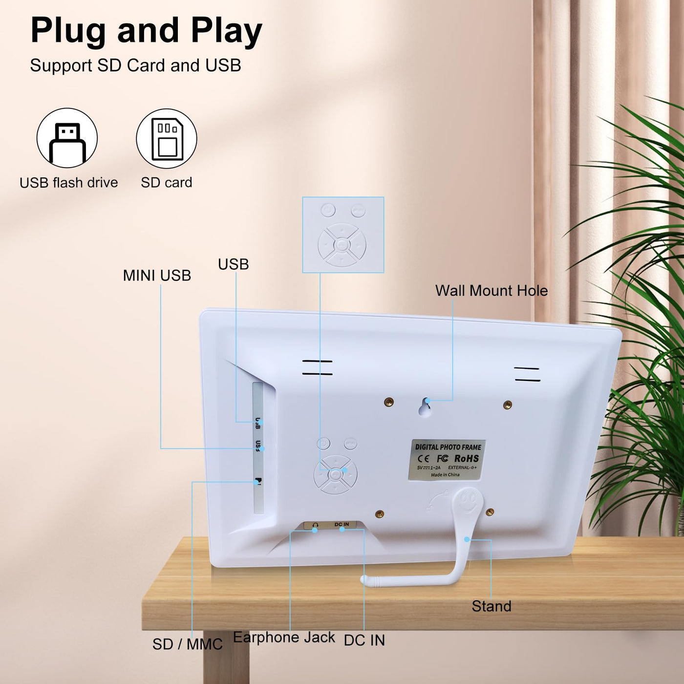 10 Inch Digital Frames With Usb Port - The Perfect Way To Display Your Favorite Photos And Videos! With Its Sleek And Modern Design, This Electronic Photo Frame Slideshow Is Perfect For Any Home Or Office. Electronic Picture Frame Has A Multi-Slideshow Function And 4 Windows Display, You Can Showcase Multiple Images At Once. Plus, Digital Photo Frames With Its Easy-To-Use Remote Control, You Can Switch Between Images With Ease. Load Your Photos And Videos Into A Usb Drive Or Sd Card And Watch Them Come To Life On This Large Digital Picture Frame. You Can Even Set Photo Video Frame To Play Background Music While Your Slideshow Is Running,Adding An Extra Layer Of Ambiance To Your Viewing Experience. Large Digital Picture Frame Packages: 1 * Bracket 1 * User Instruction 1 * Remote Control 1 * Power Adapter(5V/1.5A, 4.9 Feet) 1 * Digital Photo Frame Digital Photo Frame Features : Support The Photo Format: Jpeg / Bmp / Tiff / Png. Support The Audio Format: Mp3/ Aac/M4A/Wav/Wma/Ape Support Audio Format: Mp3/ Wav/ Mwa/ Ape/ Flac/ Ogg/ Aac/ Amr/ Aiff/ Mpc/ Wmv/ Asf Input Voltage: 100 - 240 V And 50 / 60Hz Output Voltage: 5V /1.5A Contrast: 1-100 Brightness: 1-100 Grayscale: 1-100 Auto Play: Picture/Video/Mp3 Adjustable Photo Ratio: Full Screen/ Original Size/ Scal Time Setting: Year/Moth/Day/Hour/Min Support Language: English/Spanish/Italian/Germany/Chinese