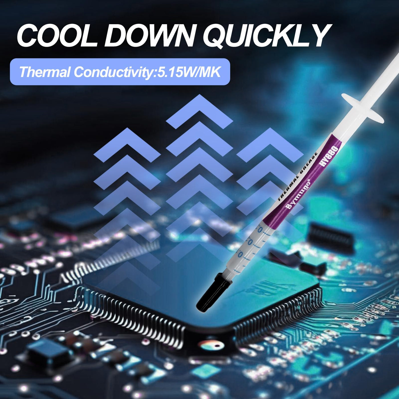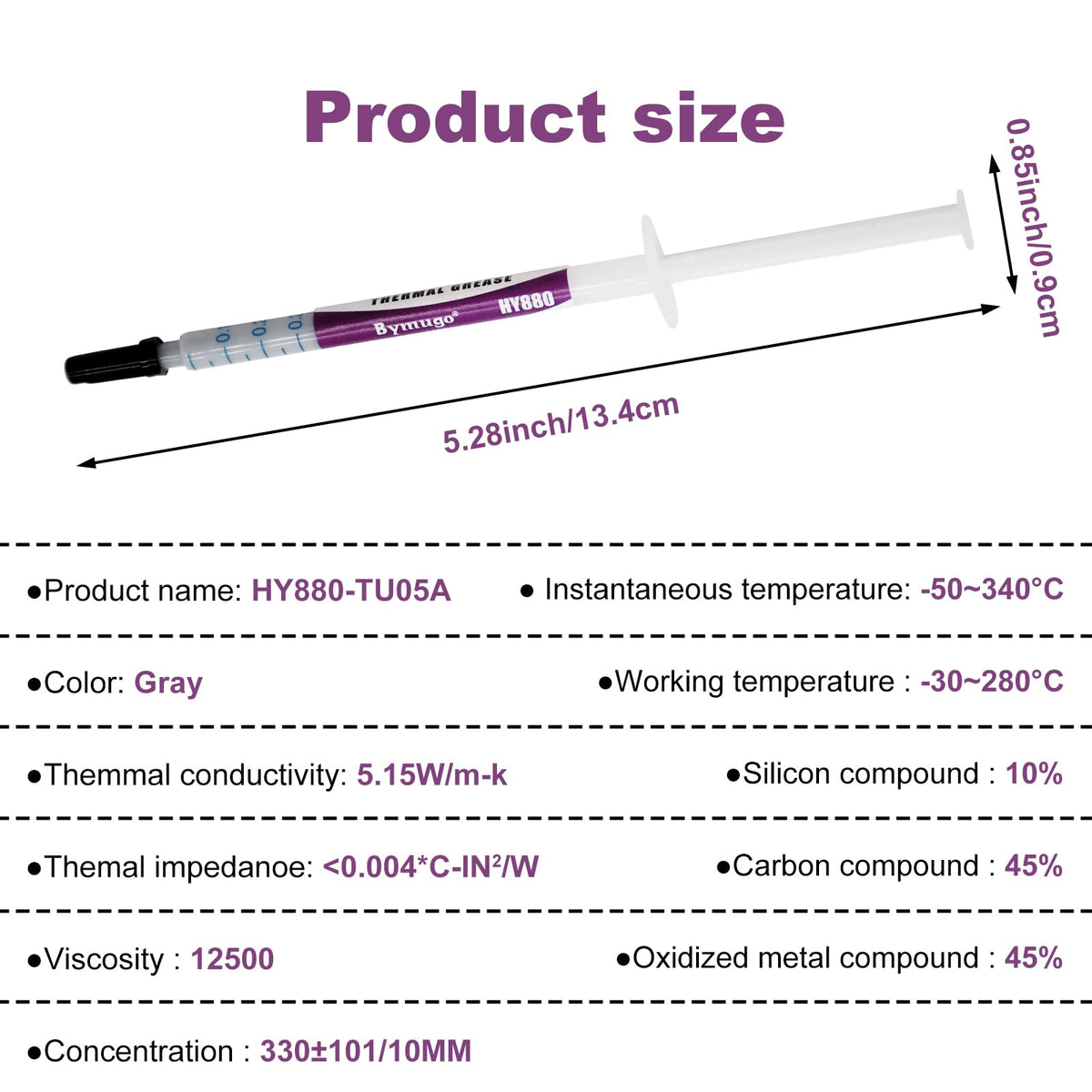 Q: What is the thermal conductivity of the HY880 Thermal Paste Kit?A: The HY880 Thermal Paste Kit has a thermal conductivity of 5.15 W/mK, which ensures efficient heat transfer from your CPU or GPU to the heatsink.