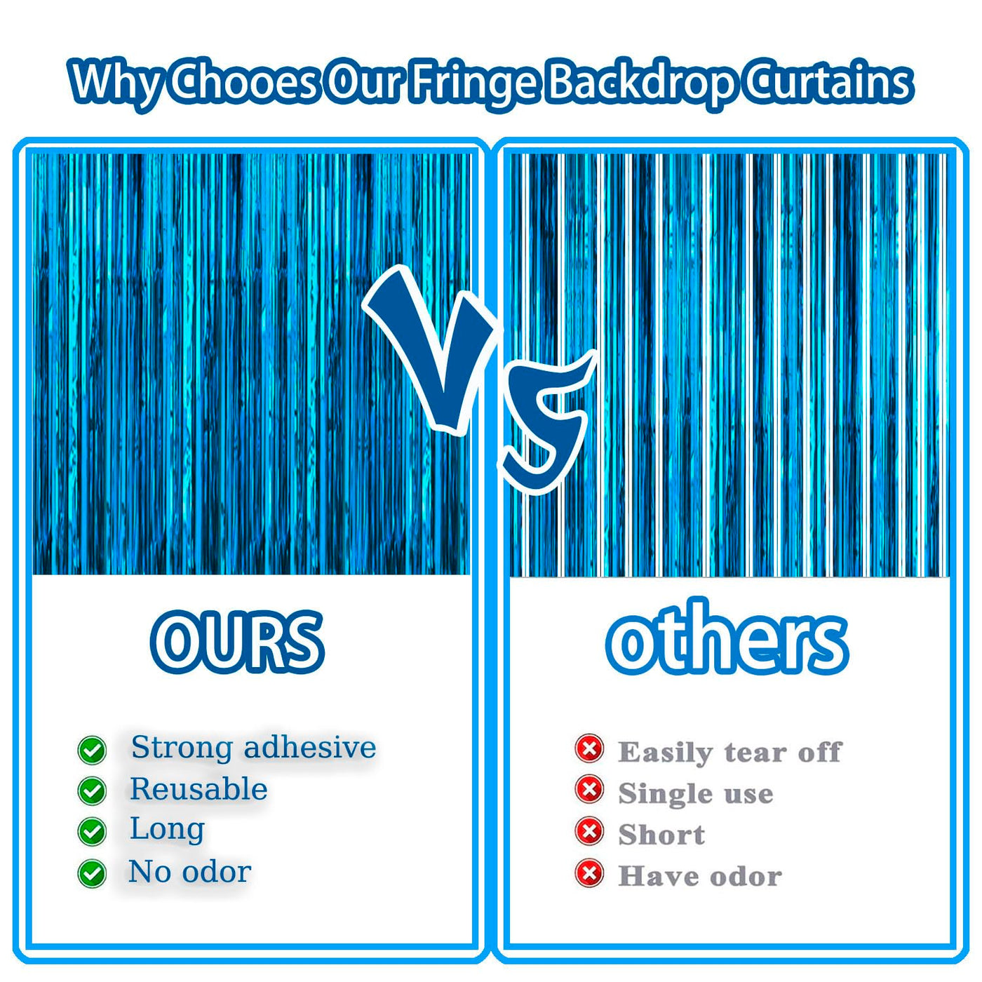 Q: What are the dimensions of the light blue metallic tinsel foil fringe curtains?A: Each fringe curtain measures 3.3 feet wide and 6.6 feet long, providing ample coverage for your party backdrop.