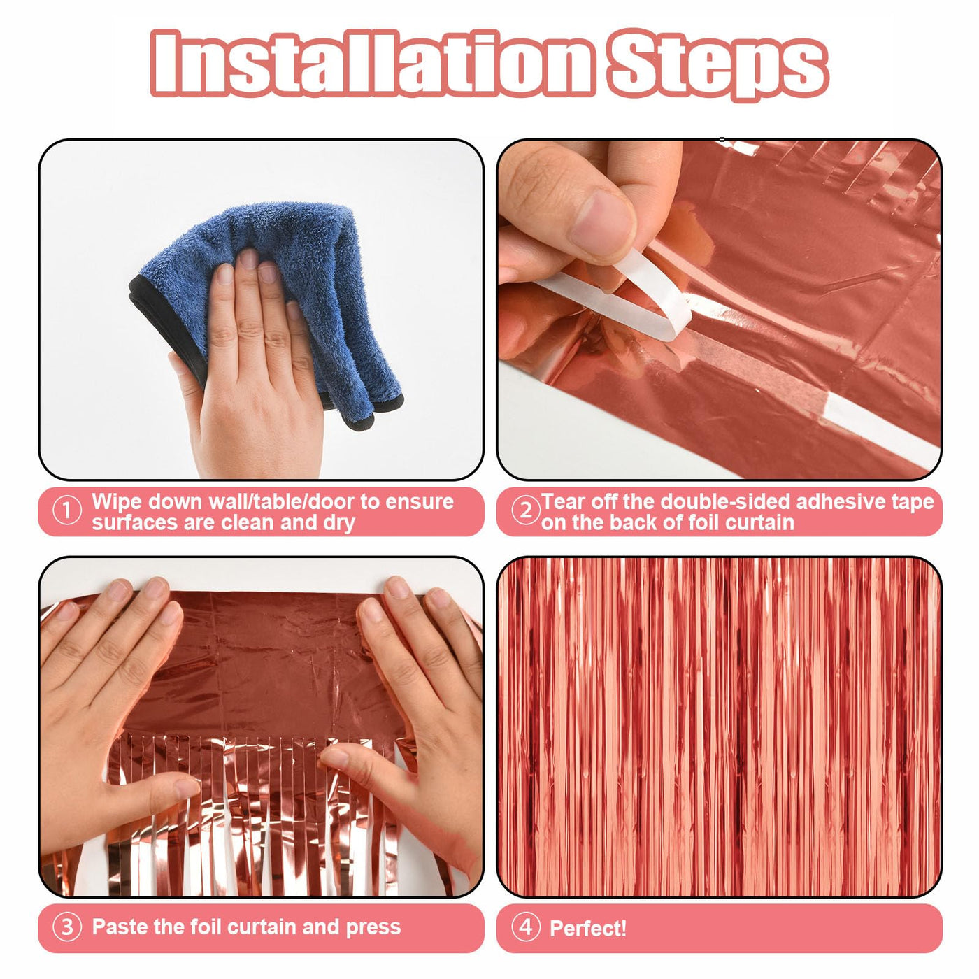 Q: How do I install the tinsel curtains?A: These curtains come with an adhesive strip on the back. Simply peel off the protective layer and stick them onto smooth surfaces like walls, windows, or doors.