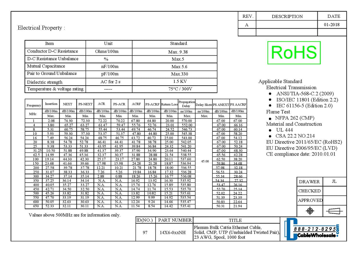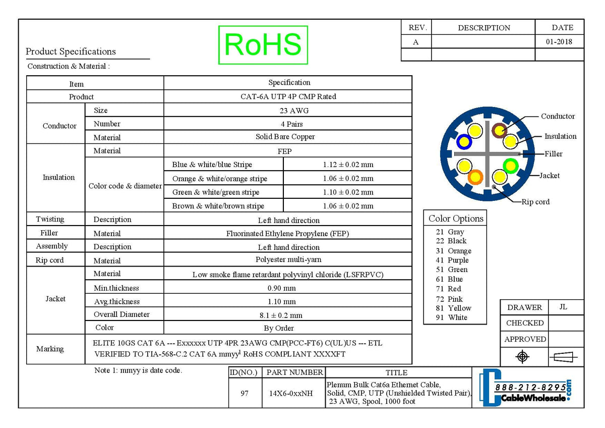 Our Quality, Bulk 1,000-Foot, Blue Plenum Solid Cat6A Ethernet Cable Is Conveniently Spooled For Easy Dispensing And For Easy Storage. This High-Performance Cat6A Plenum-Rated Ethernet Cable Is Often Used To Establish New Wiring Or To Update Or Rewire Existing Networking And Phone Infrastructures. Cat6A Cable Is Known For Its Fast Data Transfer Speeds, And Is Therefore Used In Network Applications - It Has Been Designed Specifically For 10 Gigabit Ethernet Applications. This Plenum-Rated Blue Bulk Utp (Unshielded Twisted Pair) Is 4P Cmp-Rated. In Utp Cables, Conductors Are Twisted Around Each Other In Order To Cancel Out Electromagnetic Interference (Emi) From External Sources. Additionally, This 500 Mhz Cable Features Individual Conductors That Are Made Of Premium Quality, 23 Awg (American Wire Gauge) Solid Pure Copper, Which Is Known For Its Excellent Conductivity And Superior Performance In Conductor Use. This Cat6A Ethernet Cable Is Rohs Compliant. Additionally, Our Cat6A Ethernet Cable Exceeds The Ansi/Tia-568.2-D Standard. In A Typical Residential Environment, An In-Wall Rated Cable Will Suffice. However, Additional Requirements Are Necessary When Installing Cabling In Commercial Buildings. This Is Due To The ''Plenum'' - A Designated Area Between The Floors Or Above The Office Areas That Is Used For Heating And Cooling Airflow. If An Office Were To Catch Fire, This Plenum Area Could Easily Allow The Fire To Spread To More Floors, Or Across The Entire Building. Cables That Do Not Have An Outer Jacket Rated For In Wall Or Plenum Use May Cause A Fire To Become More Intense. Plenum-Rated Cables Are Jacketed With A Fire-Retardant Plastic Jacket Made From Either A Low-Smoke Polyvinyl Chloride (Pvc) Or A Fluorinated Ethylene Polymer (Fep) For Less Toxicity During A Fire. This Cat6A Ethernet Cable'S Jacket Is Made From Low Smoke, Flame Retardant Polyvinyl Chloride (Lsfrpvc).