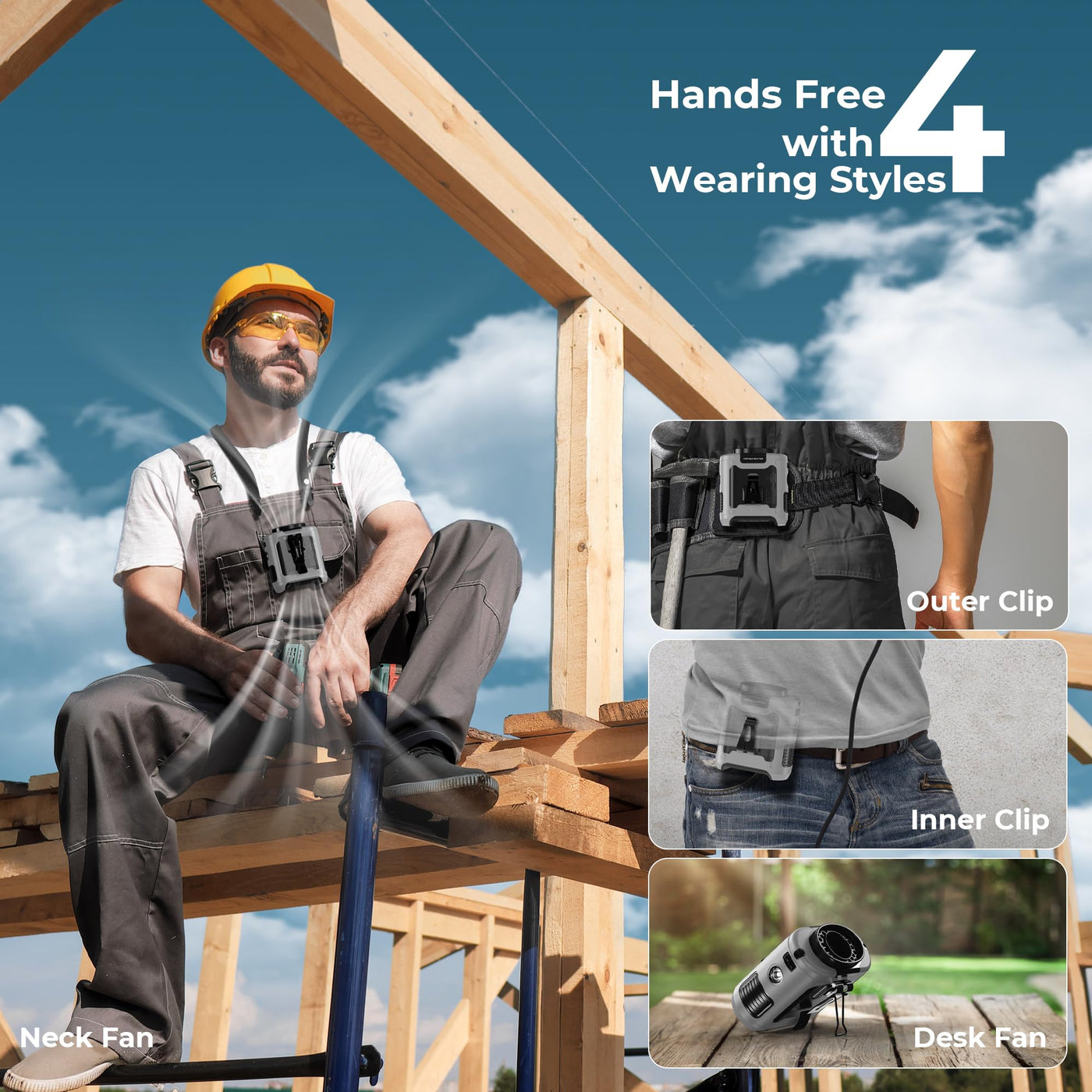 An Integrated Waist Clip Fan, Desk Table Fan, And Neck Fan. You Can Clip This Belt Fan To Your Shirts, Belt, Or Pants, Or You Can Hang The Personal Fan Around Your Neck With The Lanyard.