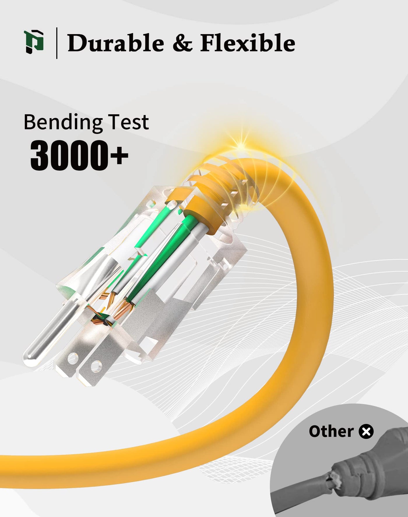 100Ft 12/3 Outdoor Extension Cord With 3-Outlets, Heavy Duty 12 Gauge 3 Prong Extension Cord Waterproof With Lighted End, 15A 12Awg 1875W Sjtw, Etl Listed - Great For Garage, Garden And Home, Yellow