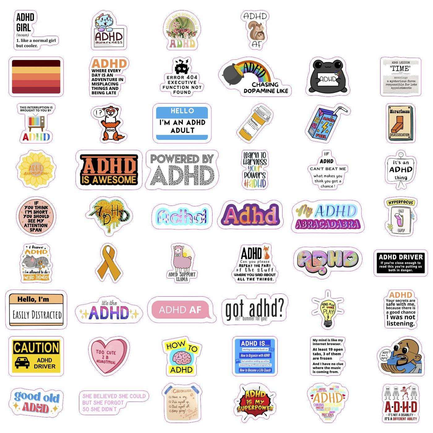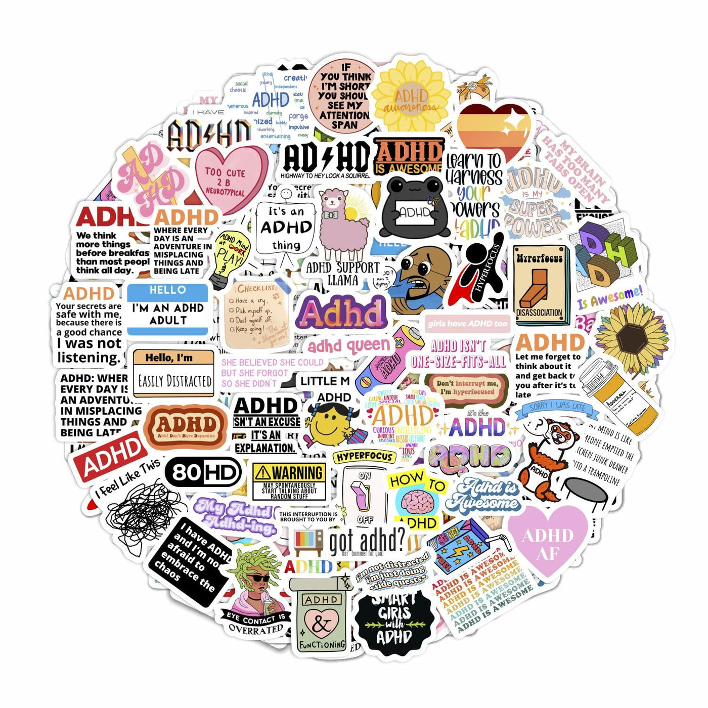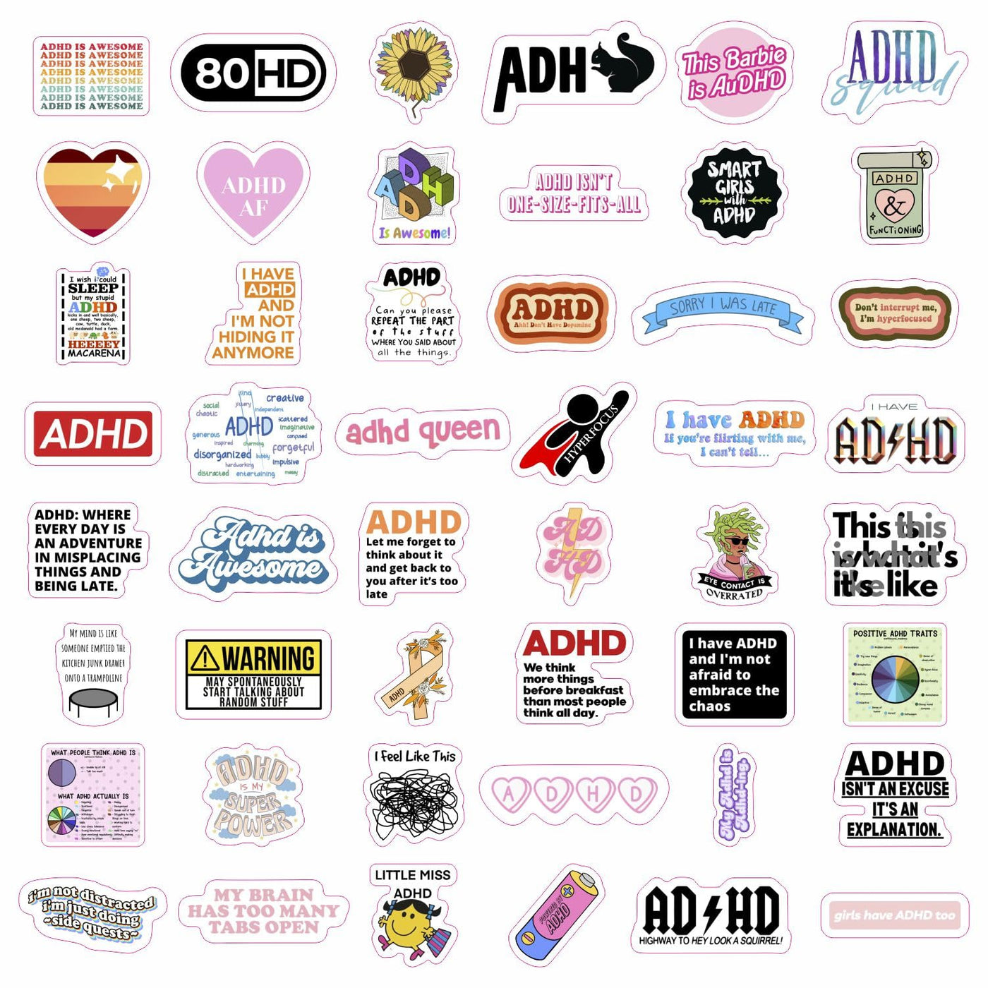 High Quality - You Can Be Sure That Only High-Quality Vinyl Is Used For Adhd Stickers. Our Stickers Are Made Of Durable Vinyl Material, Ensuring Long-Lasting Adhesion And Vibrant Colors. | Sticker Sheets - Adhd Sticker Pack Contains Several Sheets. Sticker Sheets Are Less Likely To Get Damaged Or Bent Compared To Loose, Cut-Out Stickers. | Waterproof - Adhd Decals Are Designed To Be Waterproof, So They Are Perfect For Use On Water Bottles And Outdoor Items. | Perfect Gift - Surprise Your Friends And Family With These Fun And Expressive Stickers, Perfect For Any Occasion. Stickers Are Great Adhd Gifts For Anyone Who Loves Personalizing Their Belongings. | Decor - Perfect For Decorating Laptops, Phones, Skateboards, Luggage, Bikes And More. Let Your Creativity Run Wild With Our Diverse Sticker Designs.