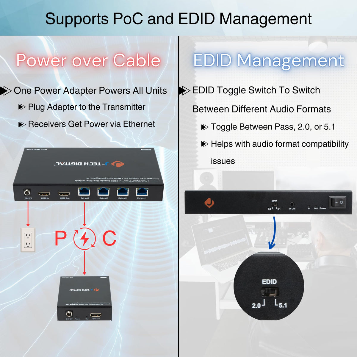 The Jtech-14Exp Is An Hdmi Extender And Splitter That Efficiently Extends A 1080P 60Hz Hdmi A/V Signal Up To 164 Feet Using A Single Cat5E/6 Ethernet Cable (Per Receiver). This System Features 1 Input And 4 Outputs, Complete With Four Receivers, And Includes A Local Hdmi Loop-Out On The Transmitter For Connecting A Fifth Display To Monitor The Source. The Power Over Cable (Poc) Function Minimizes Clutter By Requiring Only The Transmitter To Be Connected To A Power Adapter, With The Receivers Drawing Power Through The Ethernet Cables. Additionally, The Jtech-14Exp Offers Ir Control, Allowing Easy Remote Operation Of Your Source Device From Any Display Location. It Supports Various Digital Audio Formats And Includes An Edid Toggle Switch To Ensure Optimal Audio Compatibility. With Its Plug-And-Play Setup, This Unit Is Ideal For Both Commercial And Residential Setups, Providing A Tidy And Efficient Configuration.
