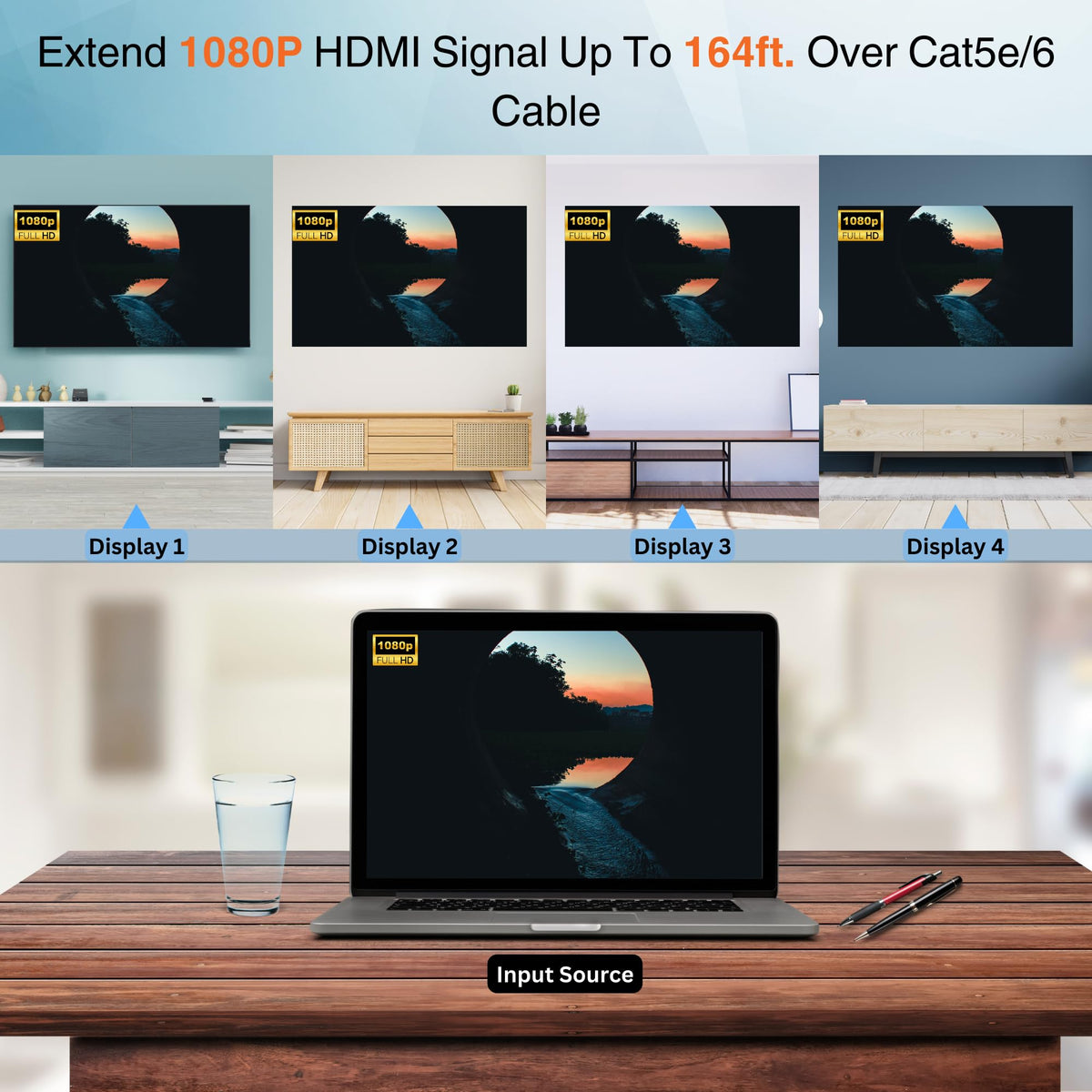 1080P 60Hz Hdmi Extender Splitter Over Single Cat5E/6 Ethernet Cable 1 In 4 Out Up To 164Ft. Features Local Hdmi Loop Out, Poc,