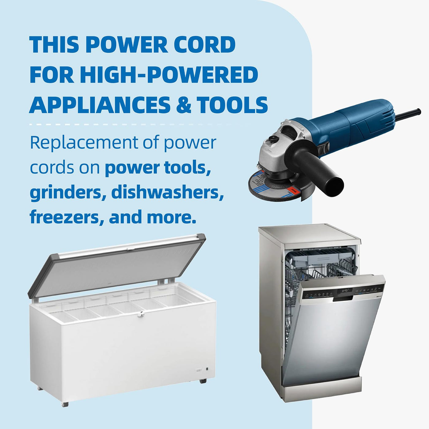 Q: What appliances can I use this 10ft 14 Gauge power supply cord with?A: This 10ft 14 Gauge power supply cord is suitable for high-powered appliances and tools, including power tools, grinders, dishwashers, freezers, and air compressors. It is compatible with 110V, 115V, and 120V power supplies, making it versatile for various applications.