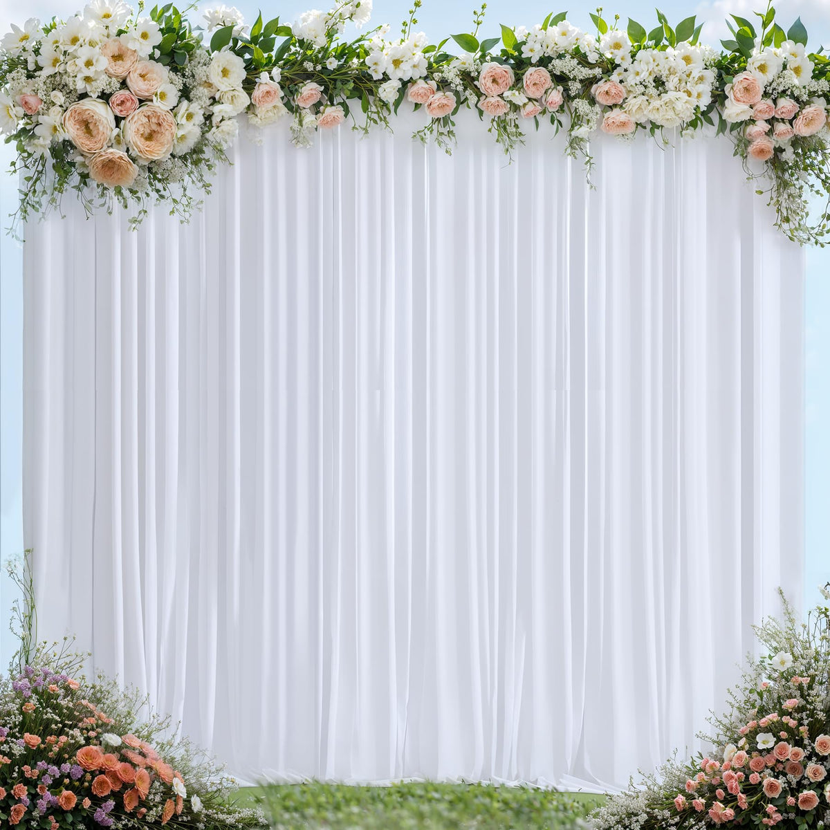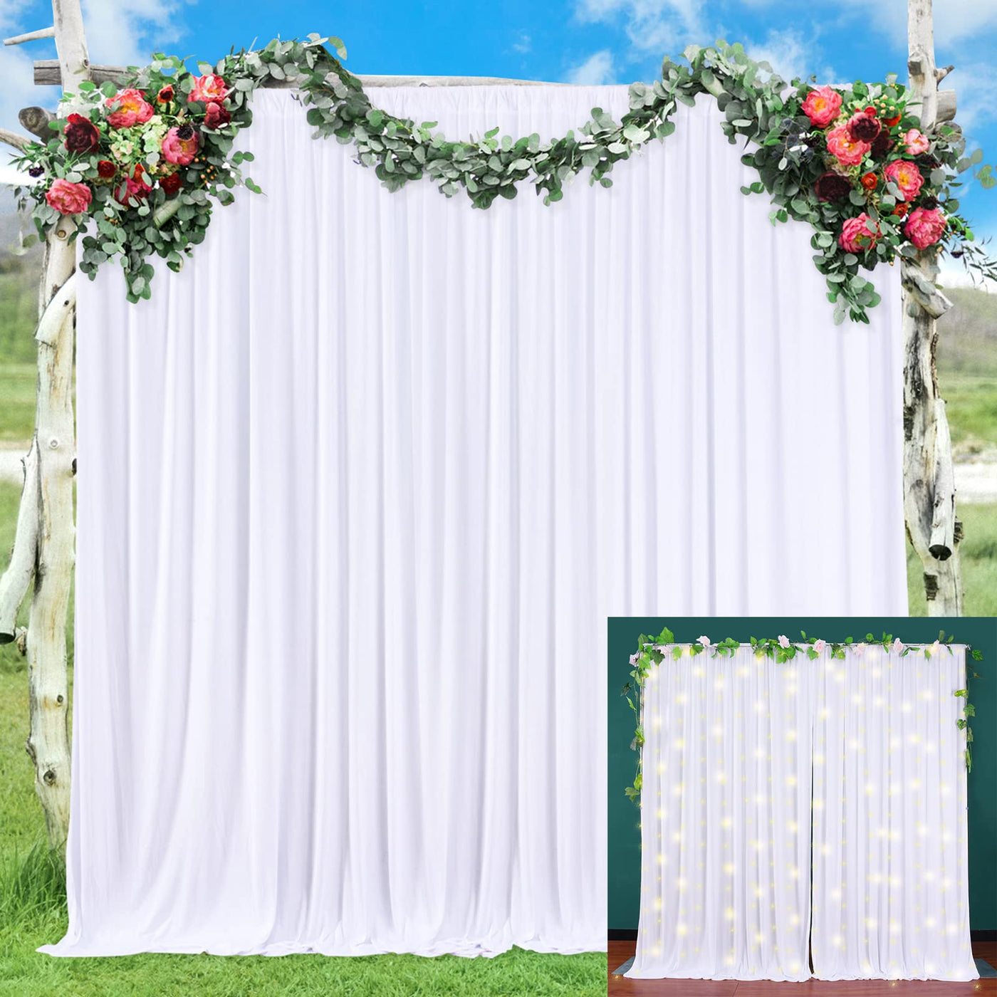 • Q: Can these curtains be used for outdoor events? A: Absolutely! These white backdrop curtains are perfect for outdoor events such as weddings, baby showers, and engagement parties, providing a beautiful background for photos.