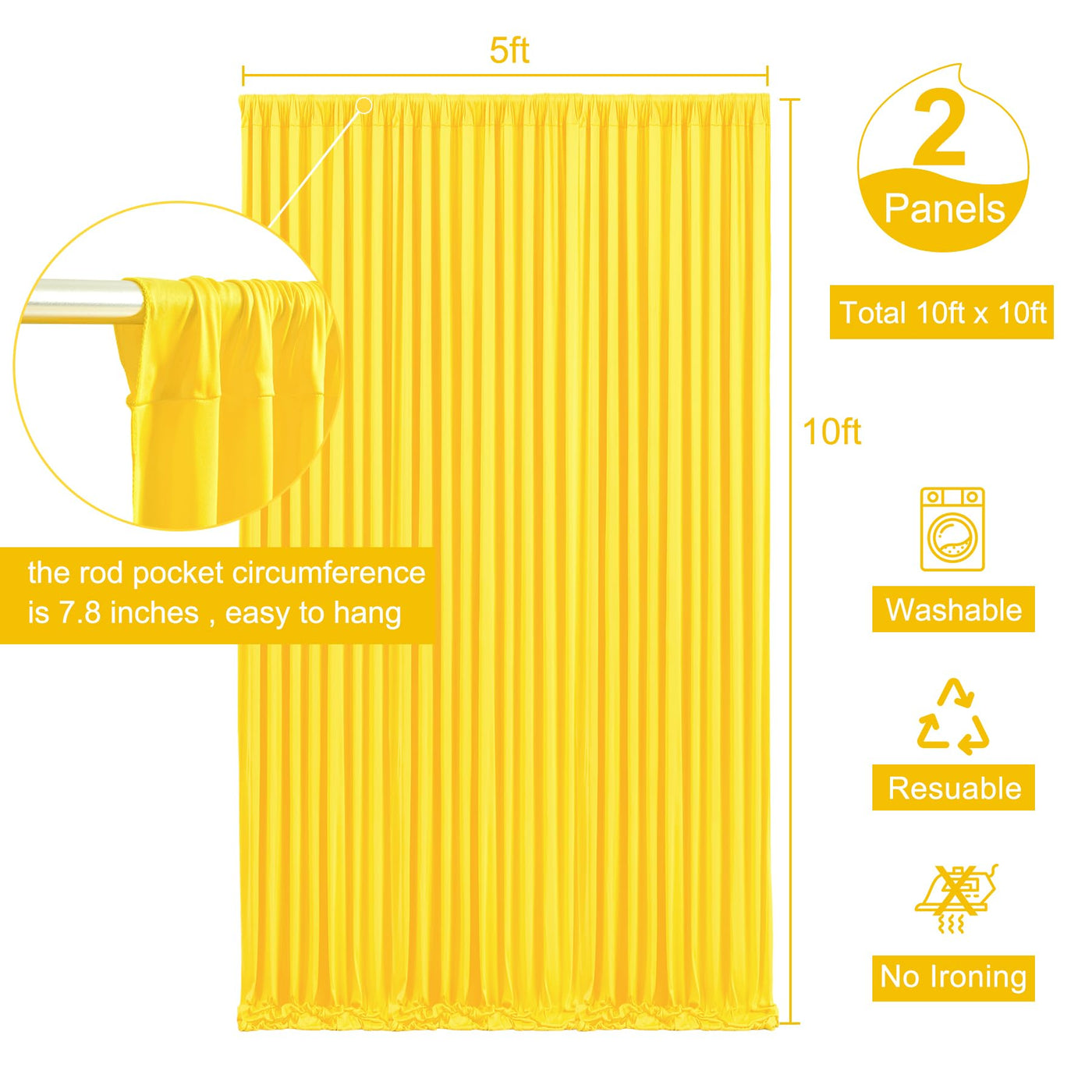 Includes: 2 Panels Soft Wrinkle Free Party Backdrop Drapes, Each Panel Backdrop Size Is 5Ft (W) And 10Ft (H), It Would Work Well In Anywhere You Want An Elegant Touch. | Material: Pure Silky Fabric Yellow Backdrop Curtains Panels. The Birthday Party Backdrop Is Wrinkle Free And Soft, Smooth Stretchy Fabric That Falls On The Floor In A Flowing Manner. | Easy To Use: Elegant Yellow Baby Shower Backdrop Curtains Has 7.8 Inches Perimeter Rod Pocket Across The Top Edge That Can Be Used To Hang Pipes And Backdrop Drapes Stand. | Occasion: Yellow Wedding Curtains Backdrop Is Suitable For Wedding, Baby Shower, Birthday Parties, Gender Reveal, Bridal Shower, Engagement, Receptions, Photo Booths, Photography Backdrop, Photoshoot, Graduation, Event Party, Ceremony, Stage Curtain, Christmas, Candy Buffet, Reception, Room Decoration, Home Decor, Chapel Backdrop Or Anywhere You Want | Resuable: Hand Wash Or Machine Wash. This Yellow Curtains For Backdrop Decorations Folds Flat For Easy Storage And Preparation For The Next Party. It