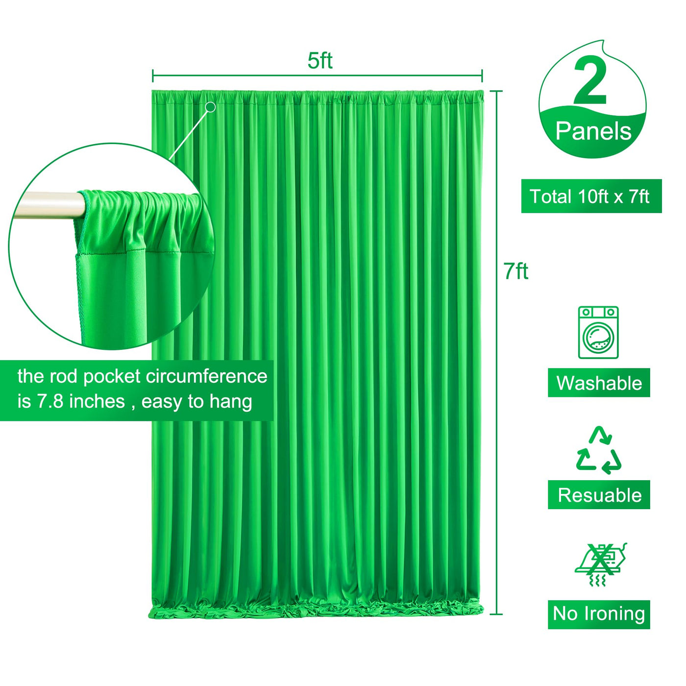 - Q: What are the dimensions of the green backdrop curtain? A: The green backdrop curtain features two panels, each measuring 5 feet wide by 7 feet high, making a total size of 10ft x 7ft suitable for various events and photography needs.