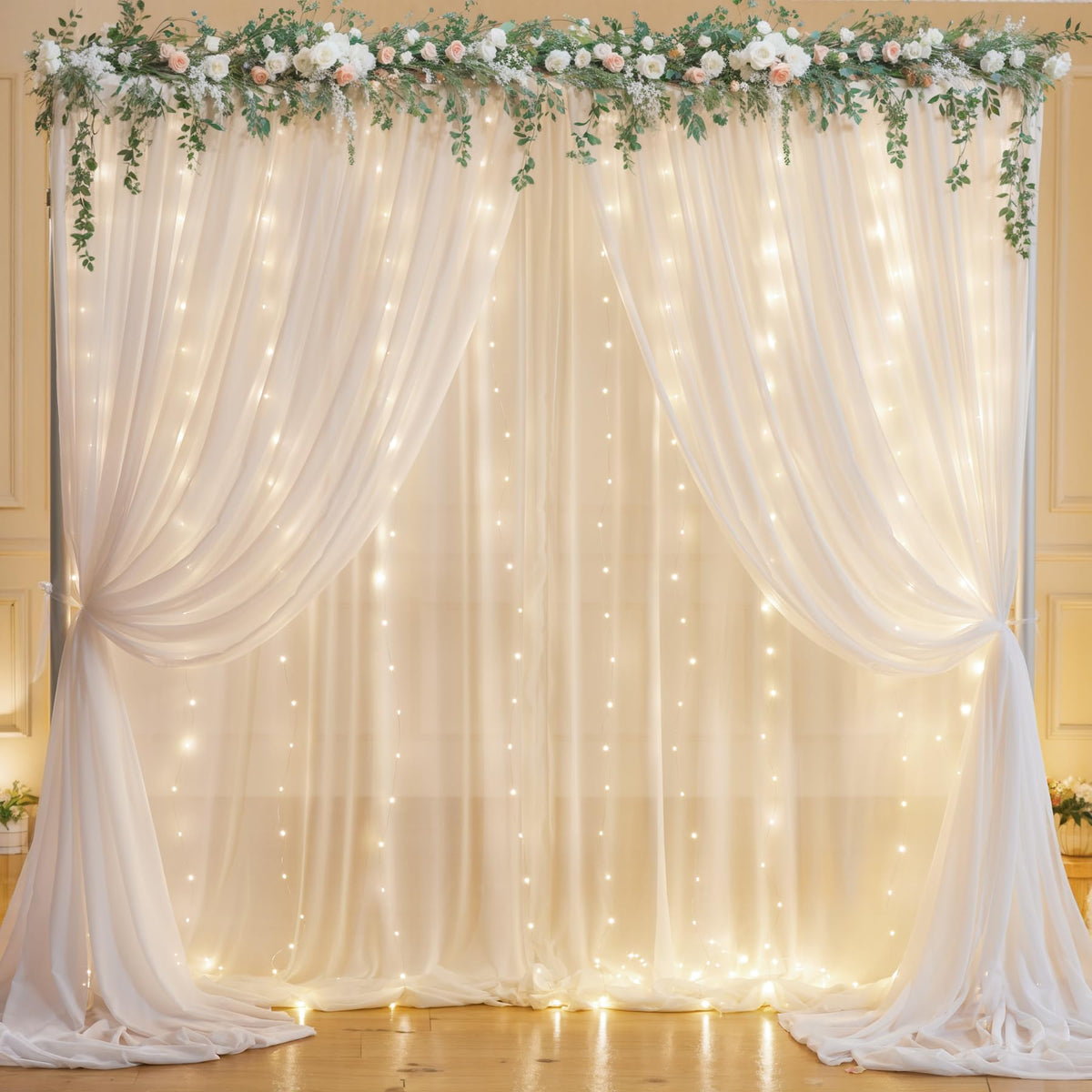 10Ft X 7Ft White Chiffon Backdrop Curtain With Lights String For Parites Wedding Wrinkle Free Curtain Photo Backdrops Drapes For Baby Shower Birthday Party Home Decorations