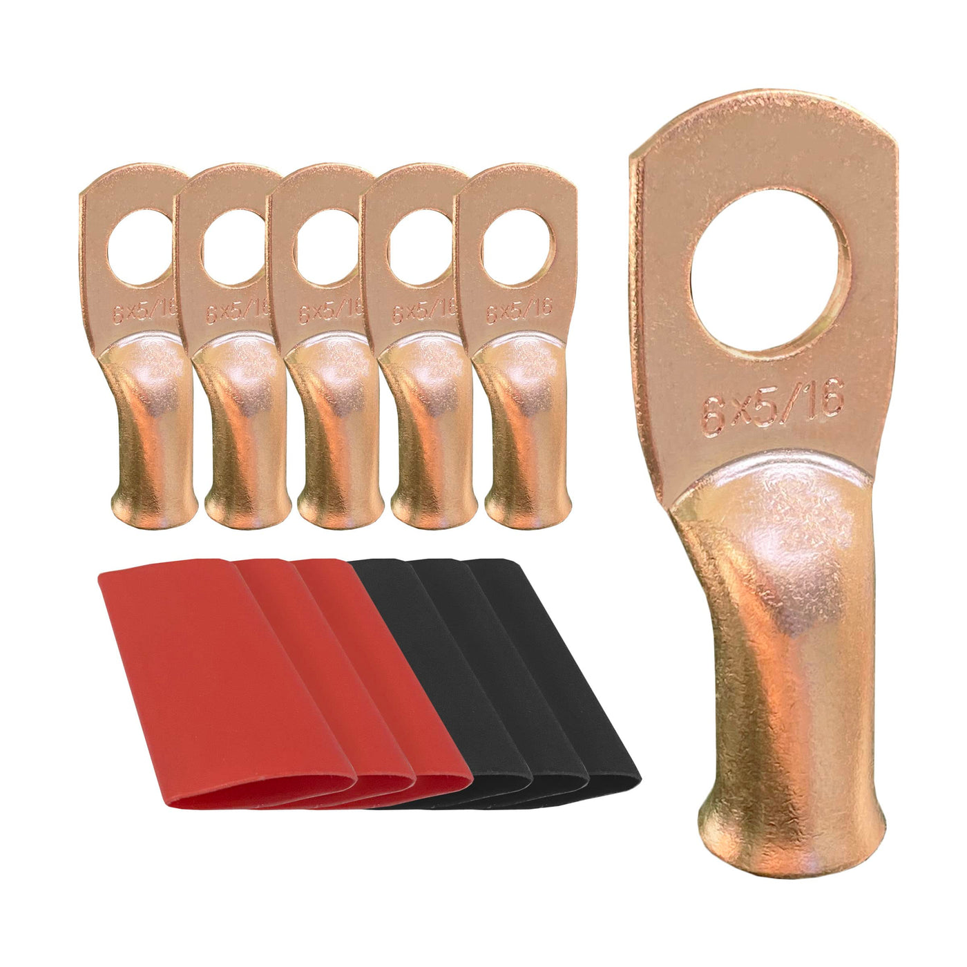 Q: What are the specifications of the 10pcs 6 AWG-5/16 Ring Battery Lugs?A: The 10pcs 6 AWG-5/16 Ring Battery Lugs are made from 100% annealed copper, designed to provide high conductivity for maximum current flow. Each terminal is compatible with 5/16" (M8) screws and comes with 3:1 dual wall adhesive waterproof heat shrink tubing for added protection.