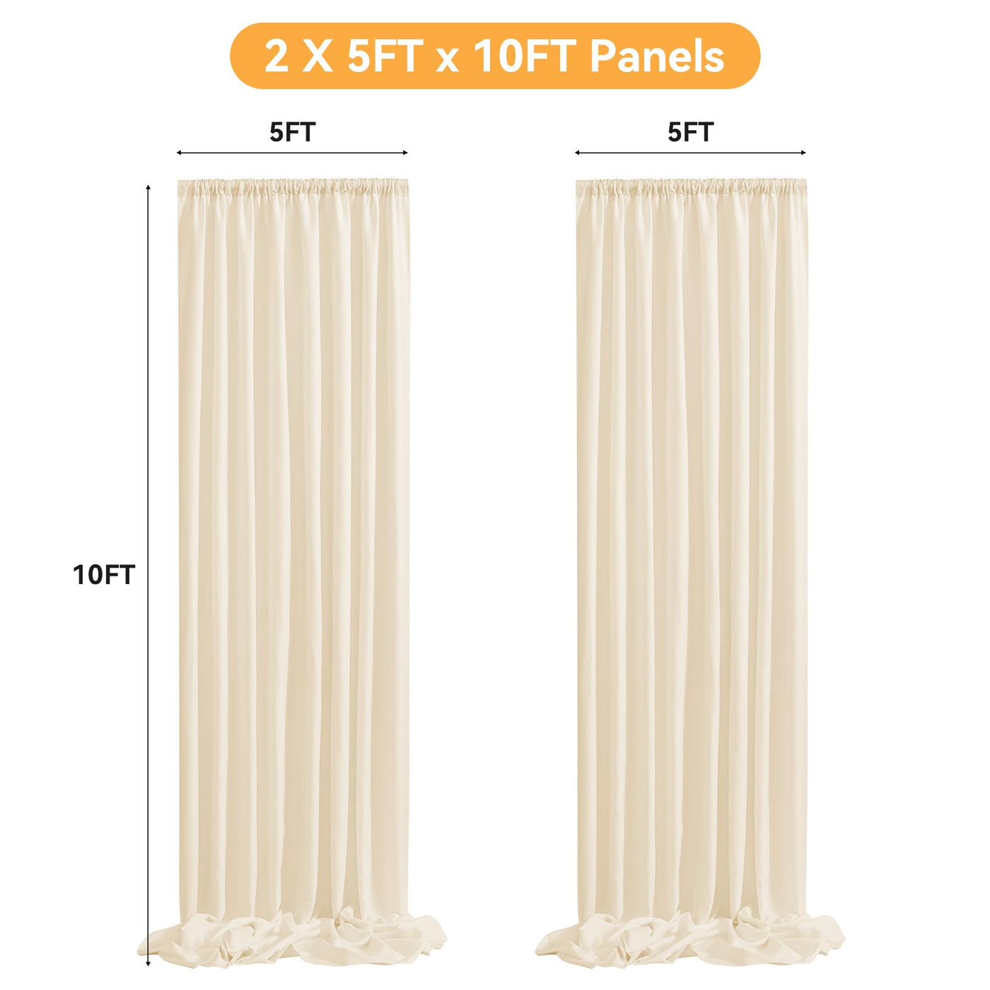Q: What are the dimensions of the backdrop curtains?A: The backdrop curtains come in a set of two panels, each measuring 5 feet wide by 10 feet high, making a total coverage of 10 feet wide when combined.