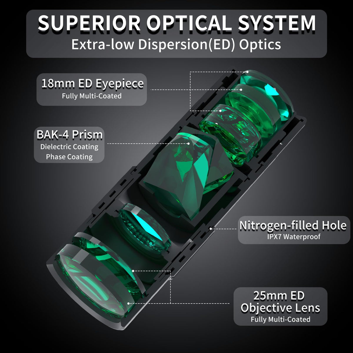 Experience Crystal-Clear Views With This Premium 10X25 Monocular Telescope. The Exceptional Optics Feature Ed Glass, Bak-4 Prism, And Fully Multi-Coated Lenses That Work Together To Deliver Outstanding Brightness And Clarity. Perfect For Travel, Hiking, Bird Watching, And Outdoor Adventures, This Compact Pocket Telescope Combines Powerful Performance With Portability. Its Impressive Macro Capability Allows Detailed Observation Of Objects As Close As 0.98 Feet, While The Durable Black Aluminum Construction With Non-Slip Grip Ensures Reliable Handling In The Field. The Nitrogen-Filled Housing With Ipx7 Waterproof Rating Means You Can Use This Monocular Confidently In Any Weather Condition Without Worrying About Fog Or Moisture Damage. A Convenient Carrying Pouch Is Included For Protection During Transport. Whether You Re Exploring Nature Or Attending Outdoor Events, This Versatile Monocular Telescope Delivers Professional-Grade Optical Performance In A Lightweight, Portable Package.