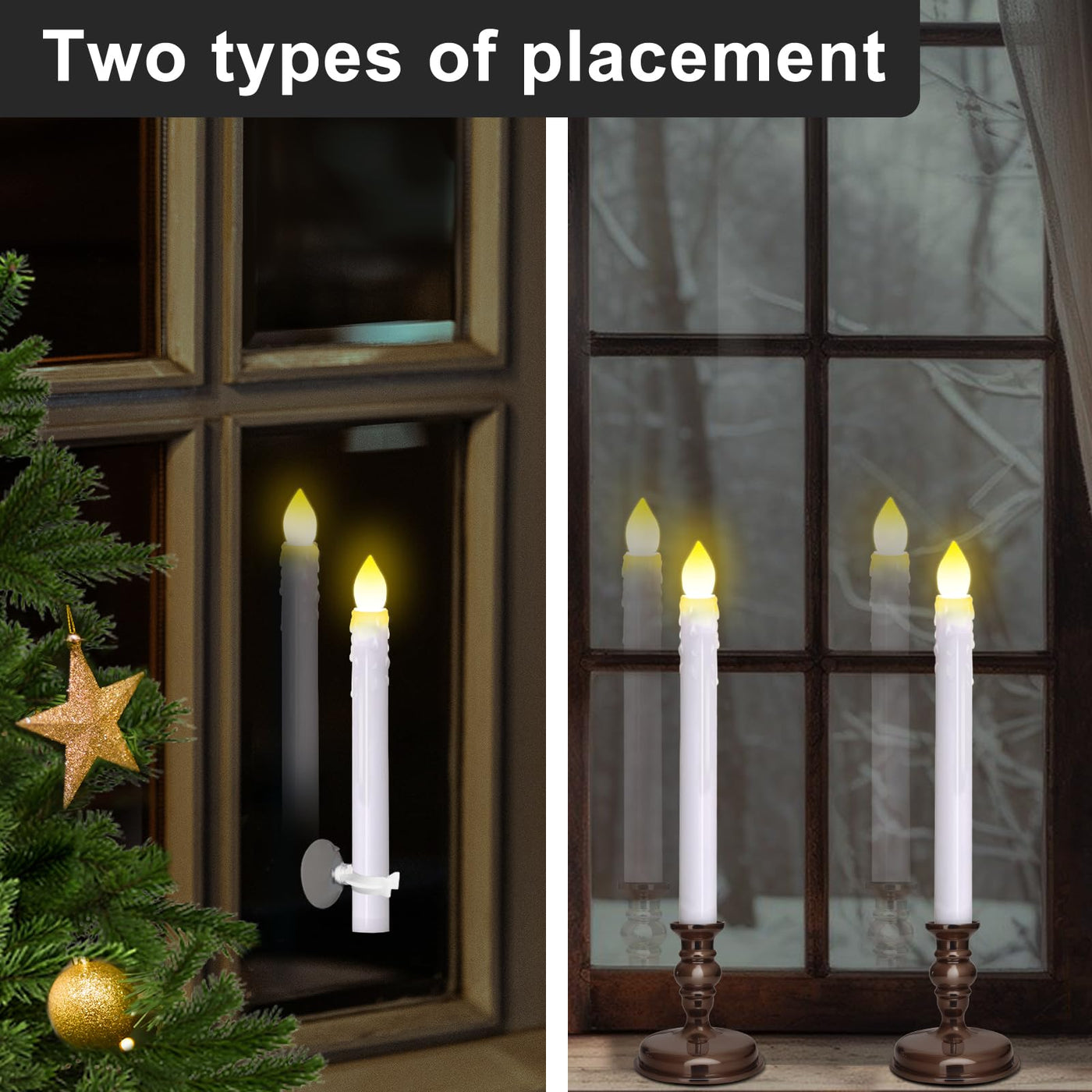 Q: How realistic do the flickering flames look on these candles?A: The flameless LED window candles feature a 3D flame design that produces a warm yellow flickering light, closely mimicking the appearance of real candlelight. The drip texture design adds to their realistic look, making them an elegant addition to any decor.