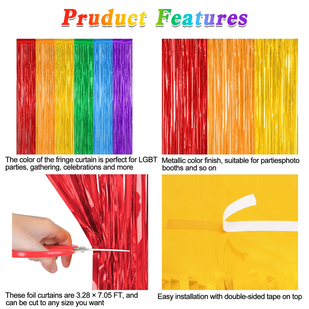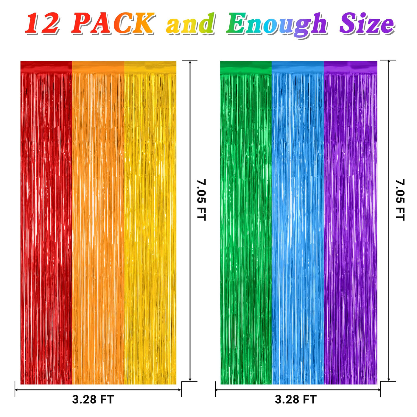 These Rainbow Backdrop Curtains Are A Great Addition To The Party! Package Includes: Red Orange Yellow Fringe Curtains X 6 Pack Blue Green Purple Fringe Curtains X 6 Pack Size: 3.28 Ft X 7.05 Ft Colors: Rainbow (Red, Orange, Yellow, Blue, Green, Purple) Design: Metallic Glossy Design Features: Large Size: Can Be Cut To Length As Needed Non-Tearable: 23 M Pet Material, Lightweight And Non-Tearable Easy To Install: Comes With Adhesive Tape, No Assembly Required Use Occasions: Lgbt Party, Birthday, Celebrations Warm Tips: The Rainbow Fringe Backdrop Come With Adhesive Paper, But Please Do Not Stick Them On Rough And Uneven Surfaces.