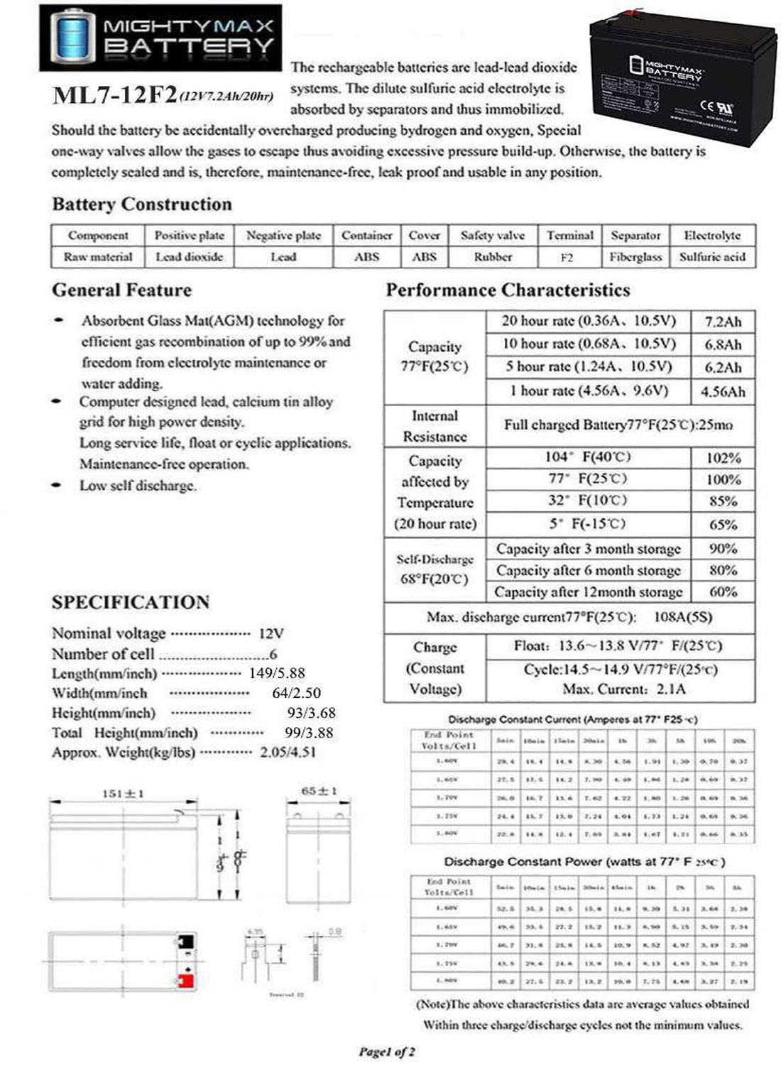Ml7-12F2 Sla Is A 12V 7.2Ah Sealed Lead Acid (Sla) Rechargeable Maintenance Free Battery - Ul Certified