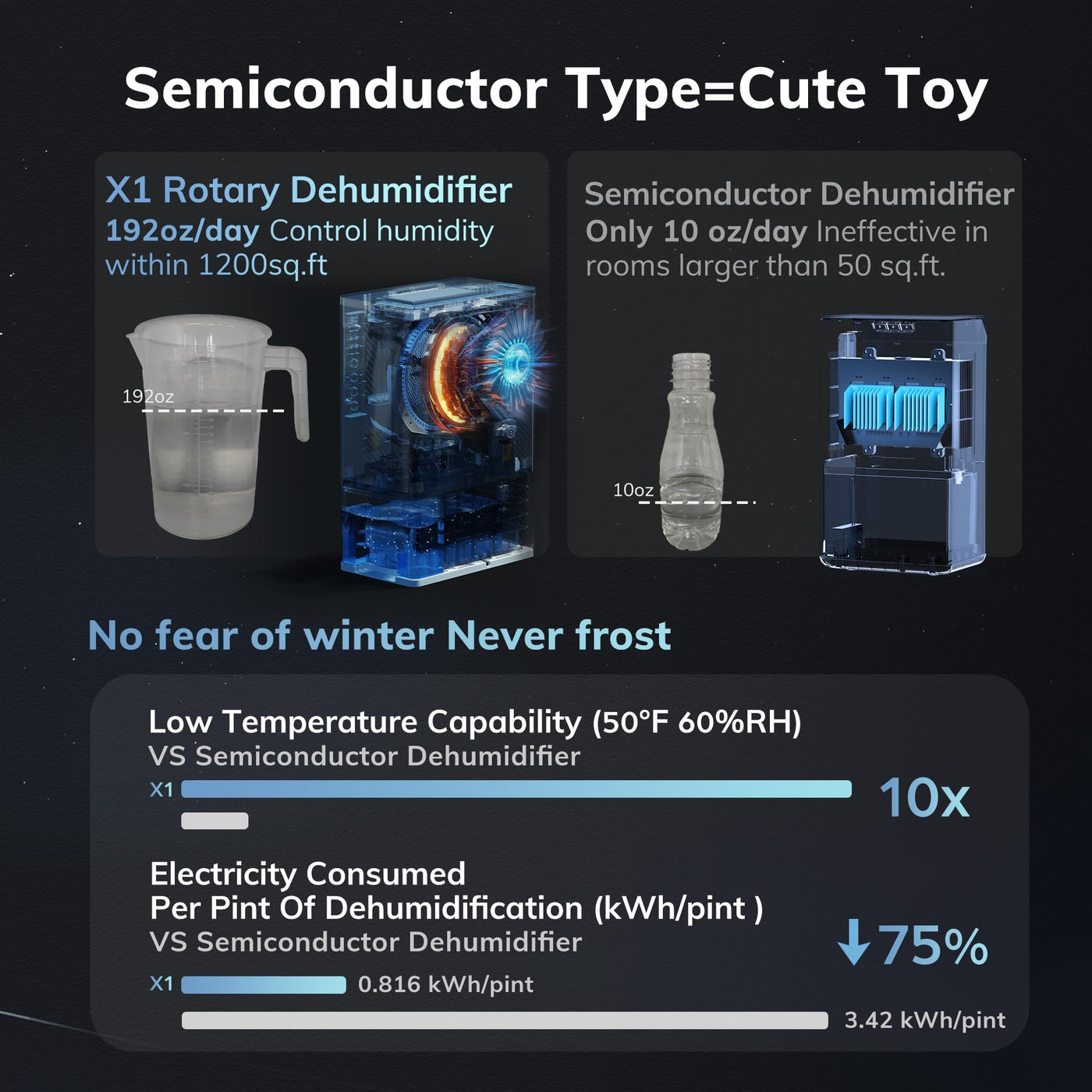 Q: How does the rotary desiccant technology differ from semiconductor Peltier dehumidifiers?A: Rotary desiccant technology, used in the AEOCKY dehumidifier, operates more efficiently in various conditions and can outperform multiple semiconductor Peltier units, especially in low temperatures, while avoiding issues like frost buildup.
