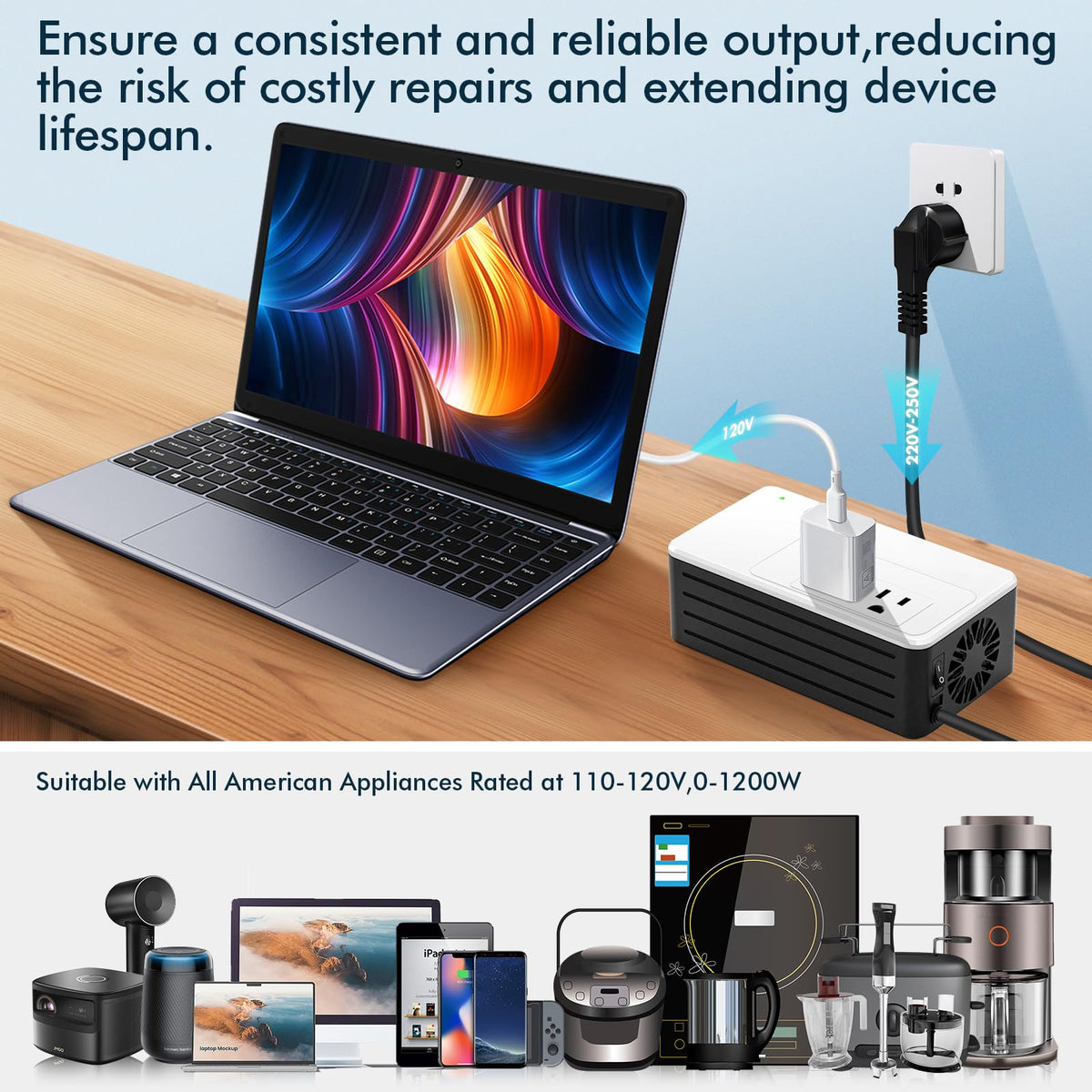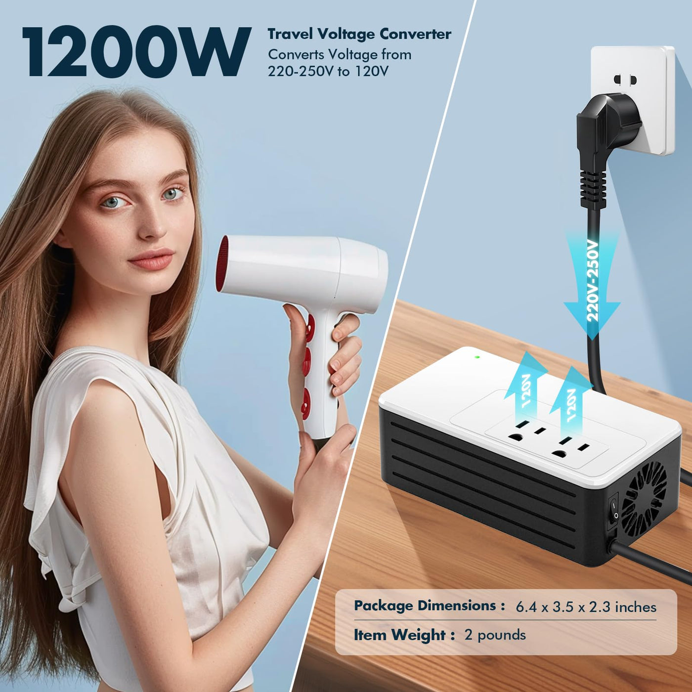 1200W Universal Travel Adapter Converter Step-Down 220V To 110V, 2 Lbs Light Weight, Stable Pure Sine Wave, For Hair Dryers, Straighteners, Curling Irons, Coffee Makers, Travel Power Plug Adapter