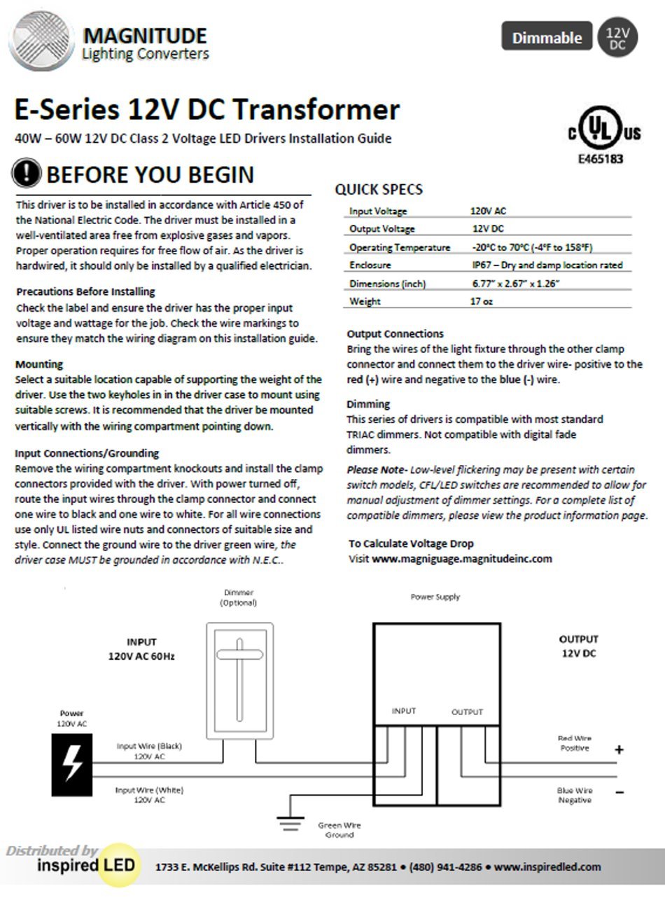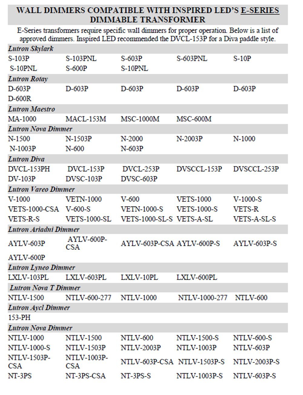 Electronic 40W Dimmable Transformer 12V Dc. The E-Series Transformer Allows You To Hard Wire And Dim Your Leds From A Compatible Wall Switch. (We Suggest Lutron Diva: Dvcl-153P Or Lutron Diva: Dvlv-600P, Please See Photos Above With Full Compatible Dimmer List) This Will Require Cable To Run From The Dimmable Transformer To The First Light(S) - Can Use Inspired Led Interconnect Cables Or In Wall Cables To Wire Nut Into The Transformer. Cables Are Not Included With Transformer And Must Be Purchased Separately.