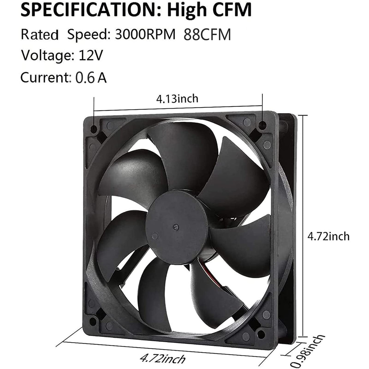 Q: What is the airflow capacity of the 120mm 12V DC fan?A: The 120mm 12V DC fan has a high airflow capacity of 110 CFM, making it suitable for effective cooling and exhaust in various applications.