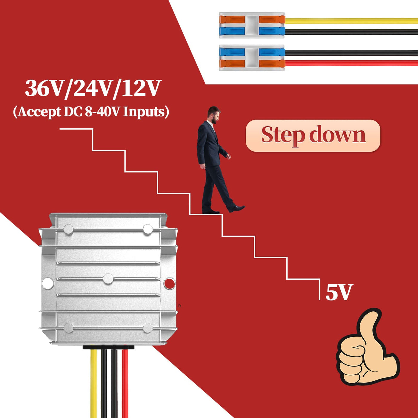 12V To 5V Converter, 24V To 5V Converter, Buck Converter 24V To 5V 10A 50W Power Regulator Safety Instructional Manual 1. The Load Connected To The Output End Of The Step Down Transformer Should Not Be More Than Max Listed Load Power, Any Higher Rated Load Will Cause Damage To The Power Regulator. 2. Can Not Used Long Time By The Max. If Your Device'S Load Is Close To Max Power, Please Select A Higher Power Converter. 3. Please Connect The Converter And Your Device According To The Wiring Diagram Provided. Features: -Ip67 Protection Grade, Waterproof And Anti-Shock Protection. -More Than 96% Power Conversion Efficiency. -Si-Fe Cores Magnetic Loop, High Temperature Resistance And Super Stability. Power Adapter Converter Specifications: Material: Plastic, Electronic Parts Input: Dc 8V - 40V Output: Dc 5V 10A 50W Conversion Efficiency: More Than 96% Overtemperature Protection: 150? Waterproof Grade: Ip67 Connection Wire Length: 13Cm(5.1 Inches) Body Size: 65Mm X 60Mm X 20Mm(L*W*H) Net Weight: 264G Dc Transformer Connection: Input: Red(+) Black(-) Output: Yellow(+) Black(-) Protection: Input Transient High Voltage Protection, Output Over-Current Protection, Chip Over-Temperature Protection. (Please Note That There Is No Input Short Circuit Protection And Reversed Connection Protection, Please Connect Wires Correctly, Or The Power May Be Burnt) Package Includes: 1 X 8-40V To 5V Buck Converter 10A 50W 2 X Wire Terminal Block